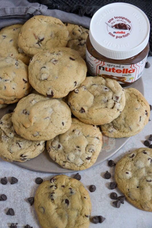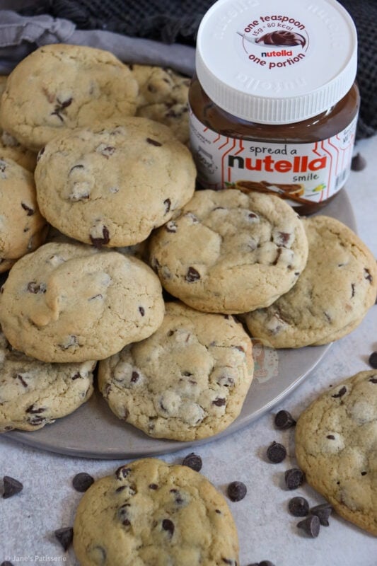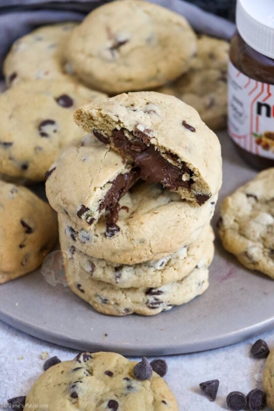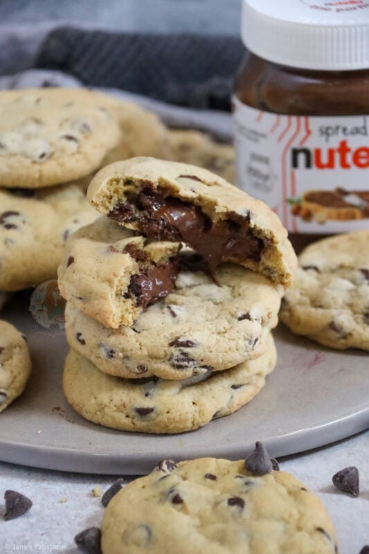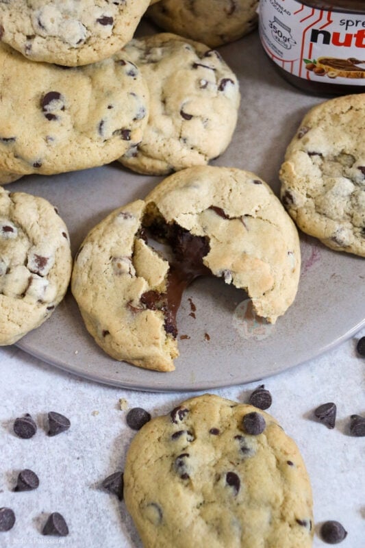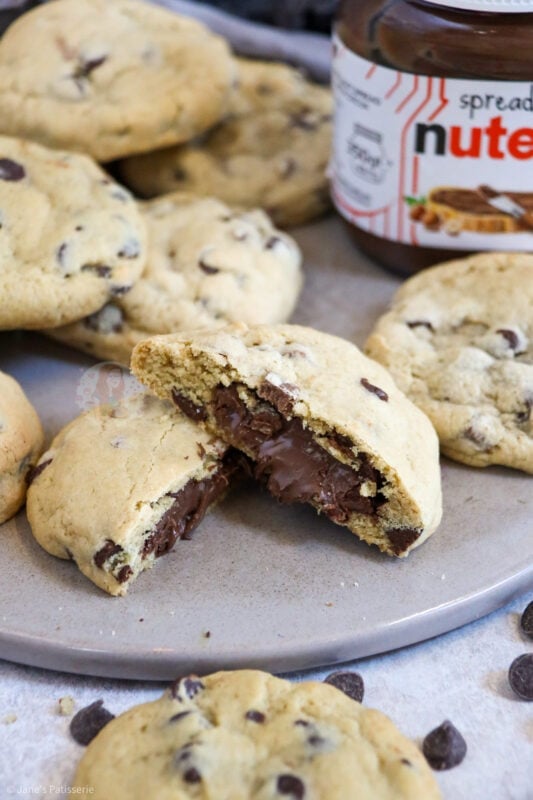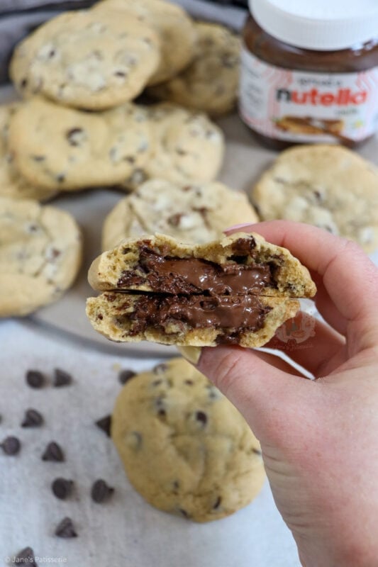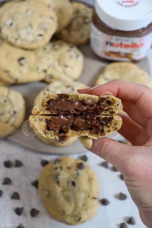 Gooey Nutella stuffed cookies with chocolate chips and a molten Nutella centre – heaven in every bite!