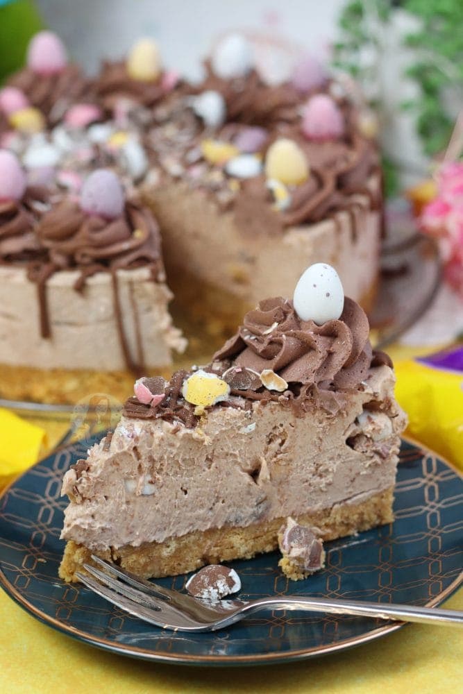 A buttery biscuit base topped with a Mini Egg chocolate cheesecake, chocolate whipped cream, and even more Mini Eggs!