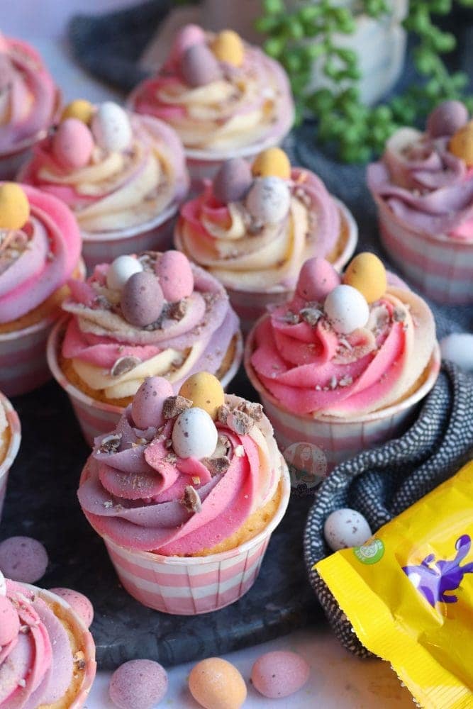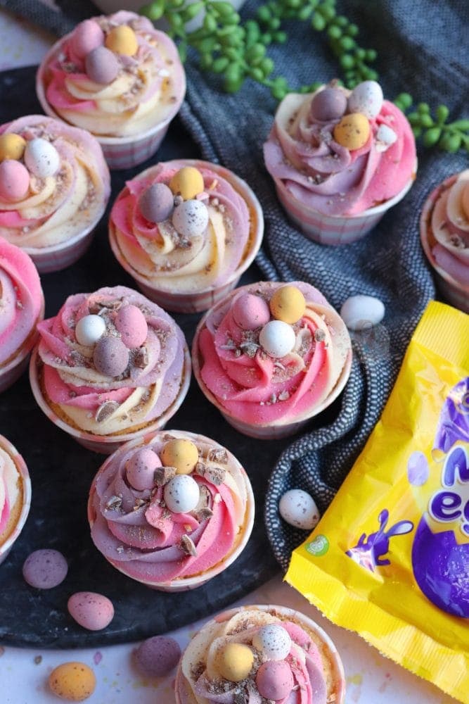 - Pipe in swirls on top of the cupcakes, and sprinkle on some crushed Mini Eggs, and some sprinkles if you fancy!
