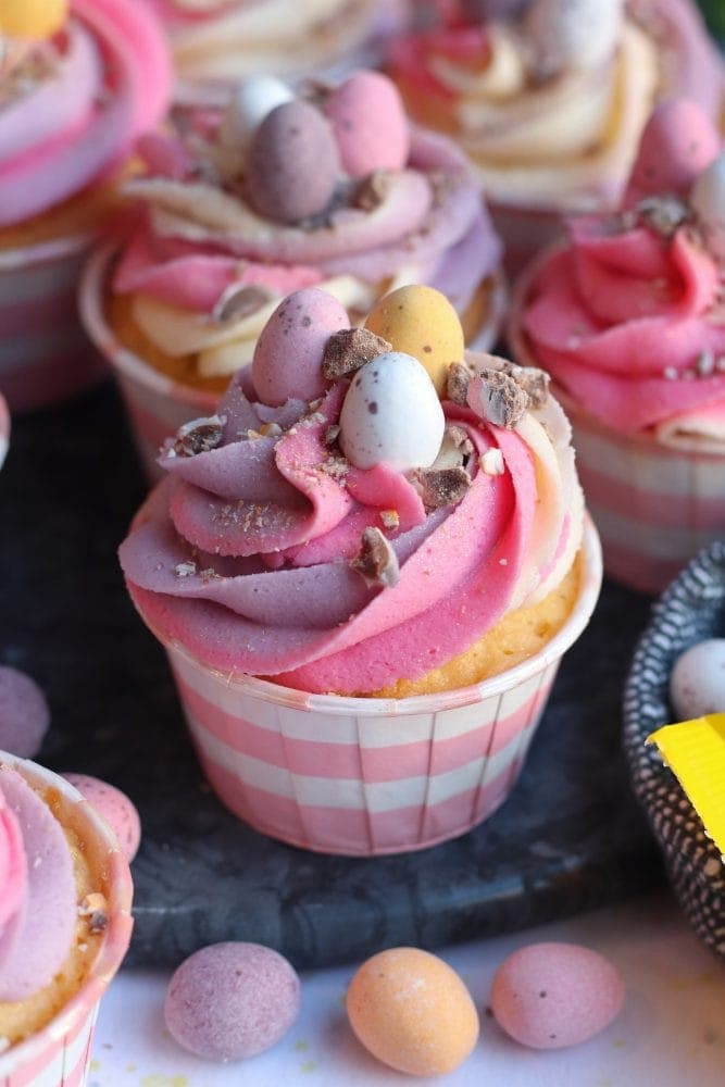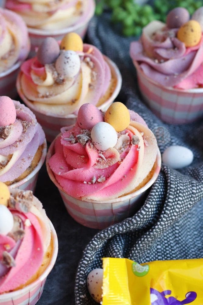 If you stick to the ideas of purple, pink and yellow, then you have a beautiful pastel swirl effect on the top of the cupcakes, and it just looks so perfect for Easter! Everything pastel is beautiful anyway, but it’s ideal at Easter time.