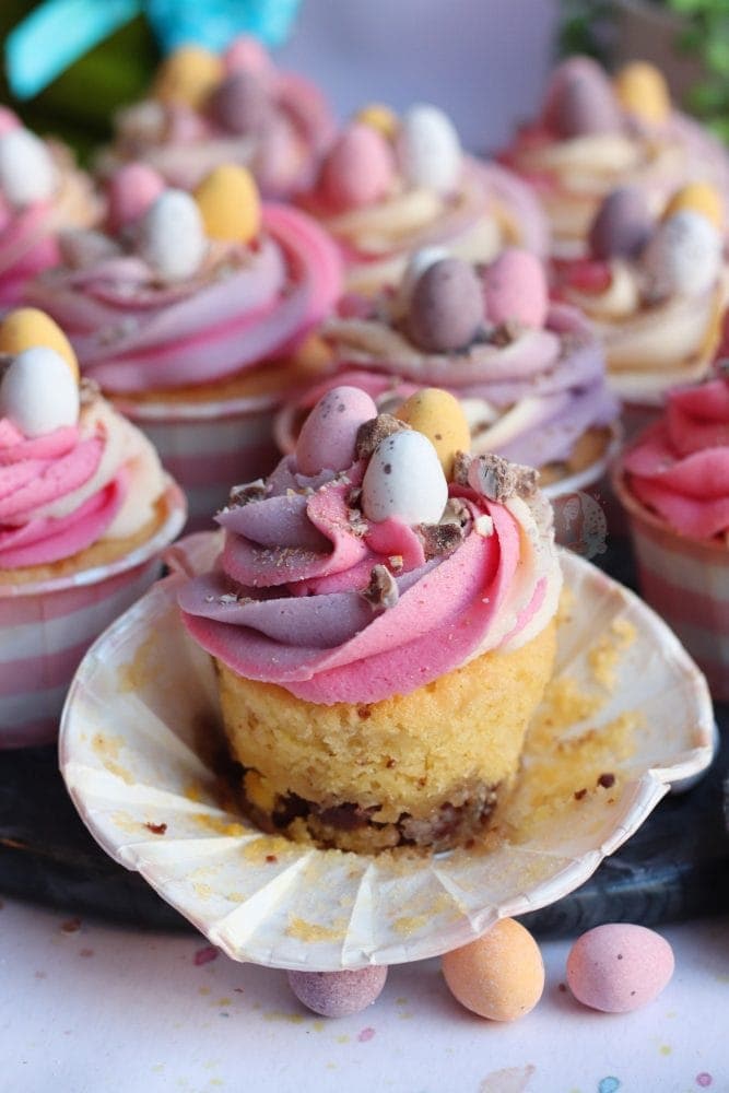 There are several different ways of doing the actual cupcakes. You can have them as they are in the recipe, with a vanilla sponge, crushed Mini Eggs folded through. Or, you can hollow out the centre, and have Mini Eggs in the centre of the Cupcakes. Thirdly, you can even make the cupcakes chocolate flavour, by taking our 25g of flour, and adding in 25g of cocoa powder!