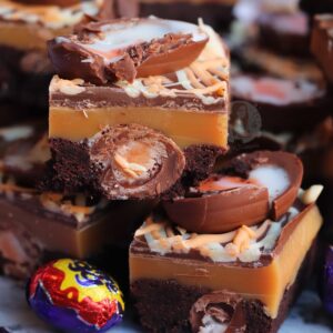 Chocolate shortbread stuffed with Mini Creme Eggs, homemade caramel, and even more chocolate Creme Egg goodness! Creme Egg millionaires shortbread HEAVEN!