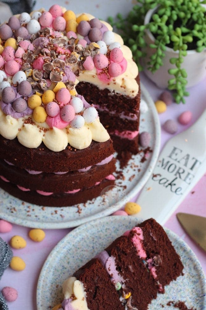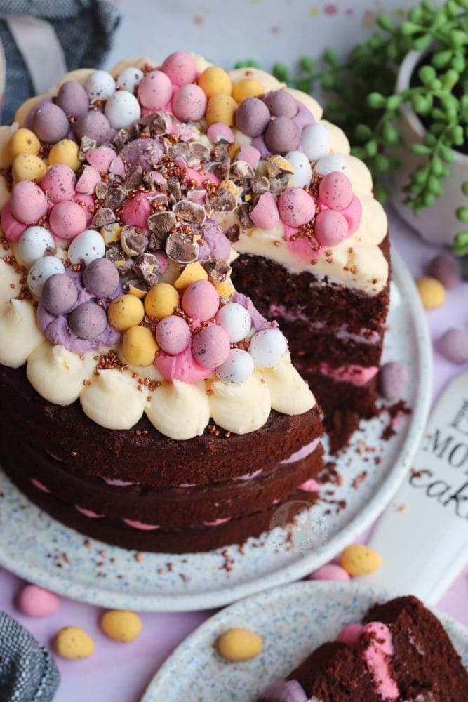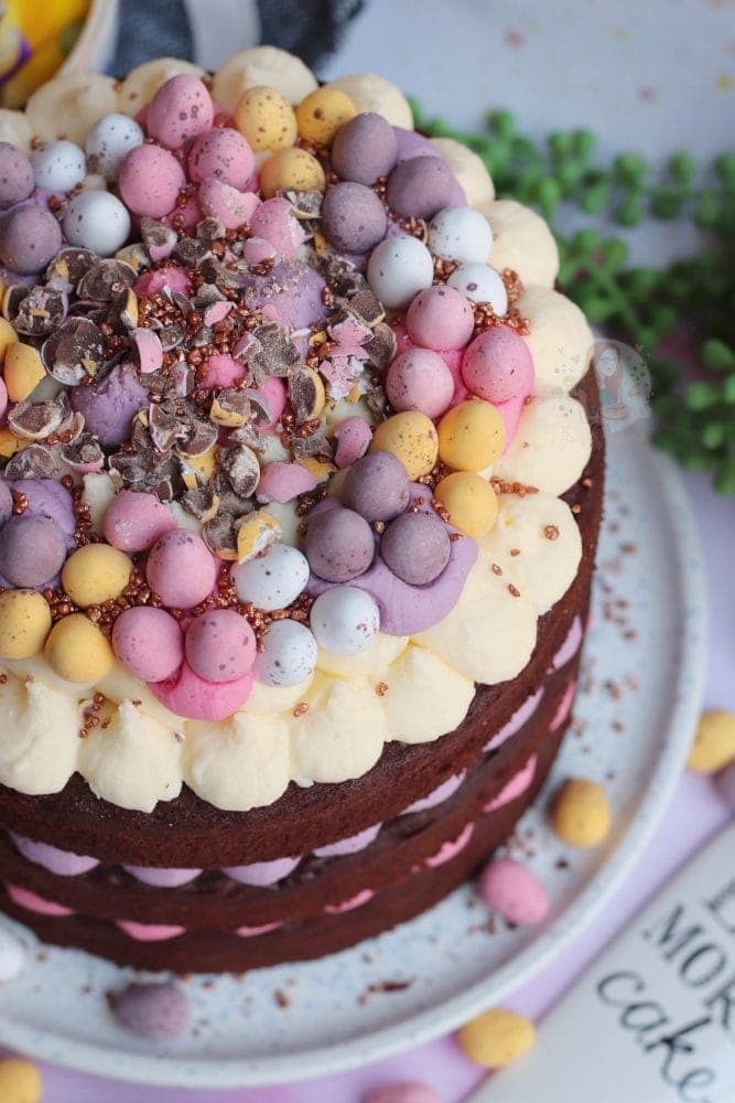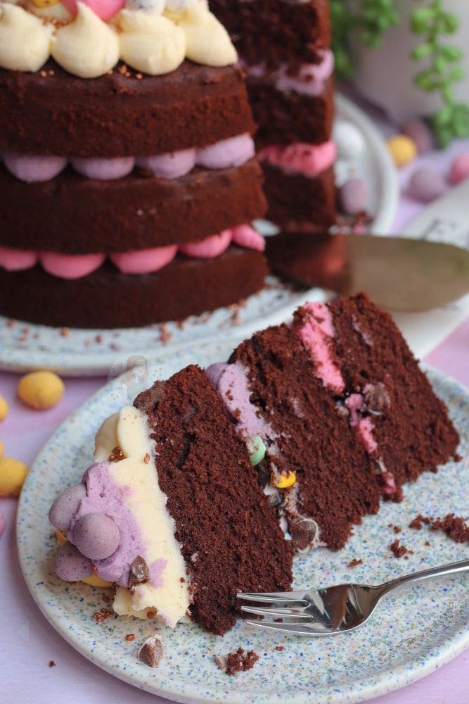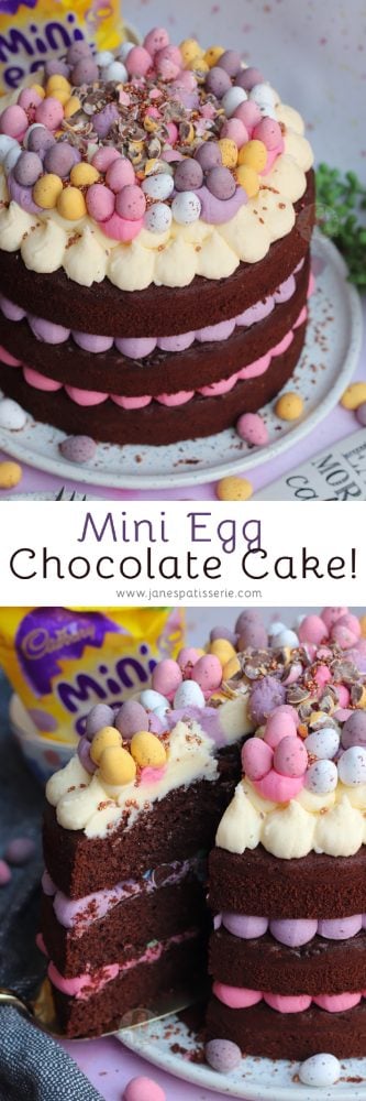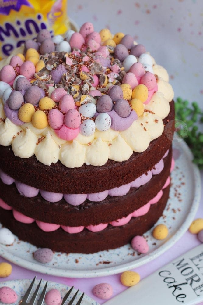 A three-layer Mini Egg chocolate cake with pastel vanilla buttercream frosting and Mini Eggs! Perfect Easter showstopper!
