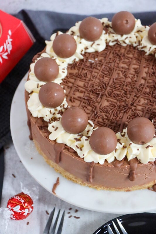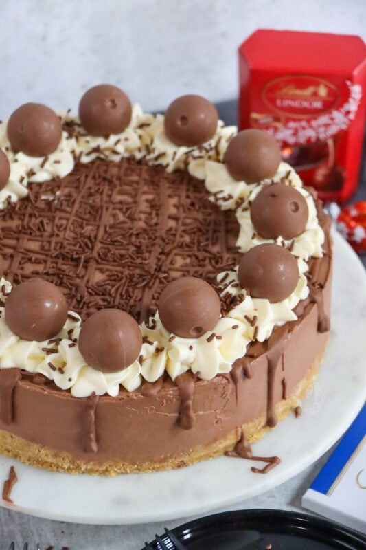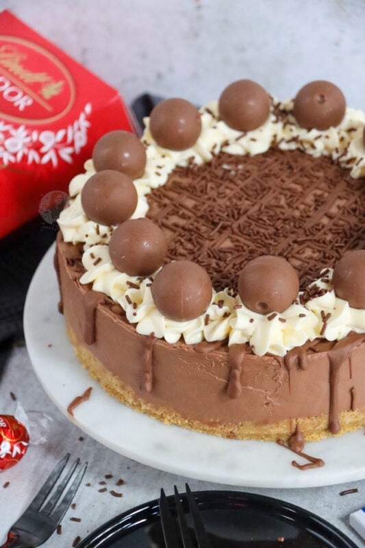 A delicious no-bake Lindt chocolate cheesecake with Lindt truffles and a Lindt chocolate drizzle!