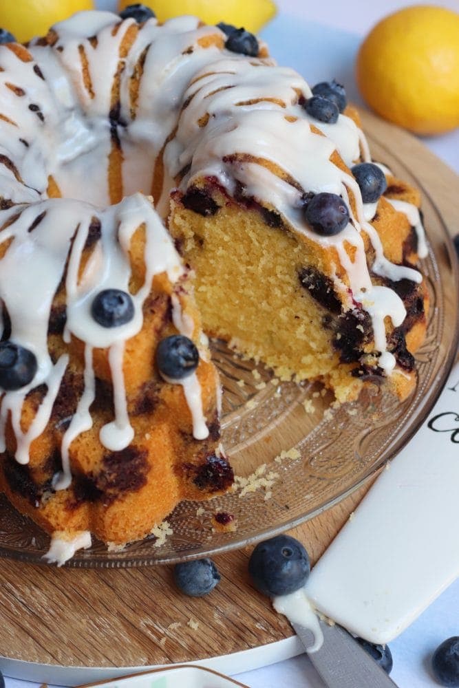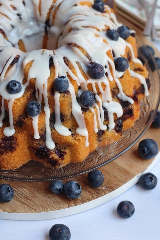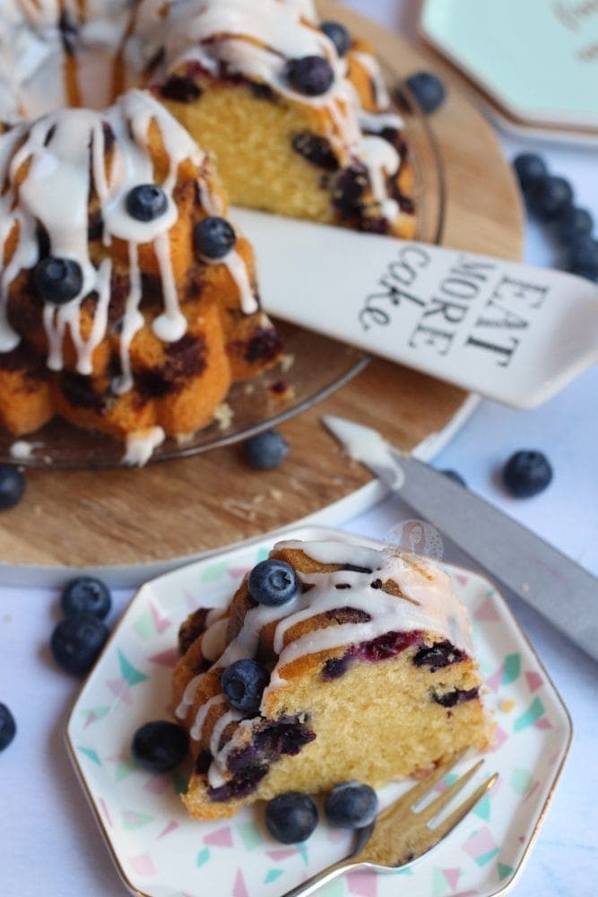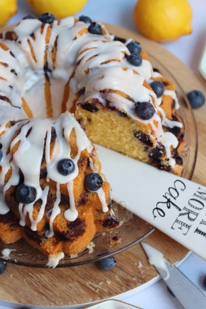 - Whisk together the icing sugar and lemon juice and carefully drizzle onto the cake, and sprinkle over the fresh blueberries.