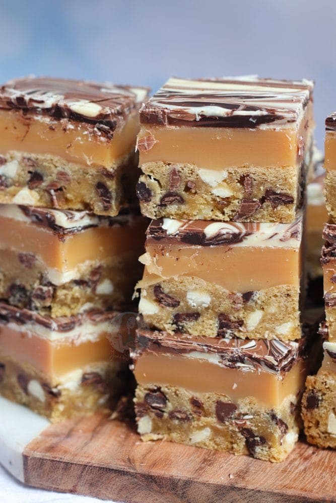 Triple chocolate chip cookie bars, with homemade caramel, and a triple chocolate layer… millionaires cookie bars!