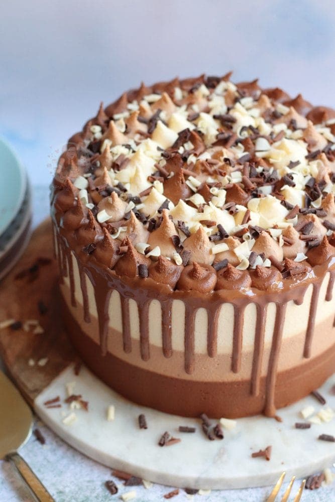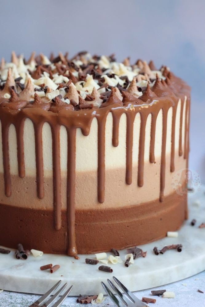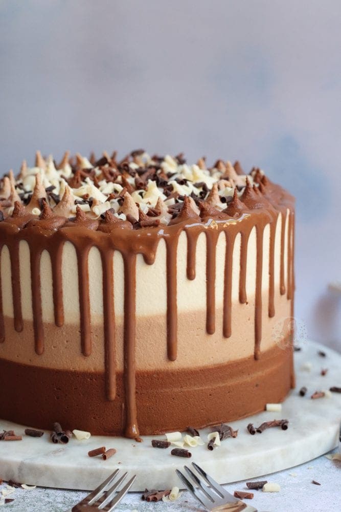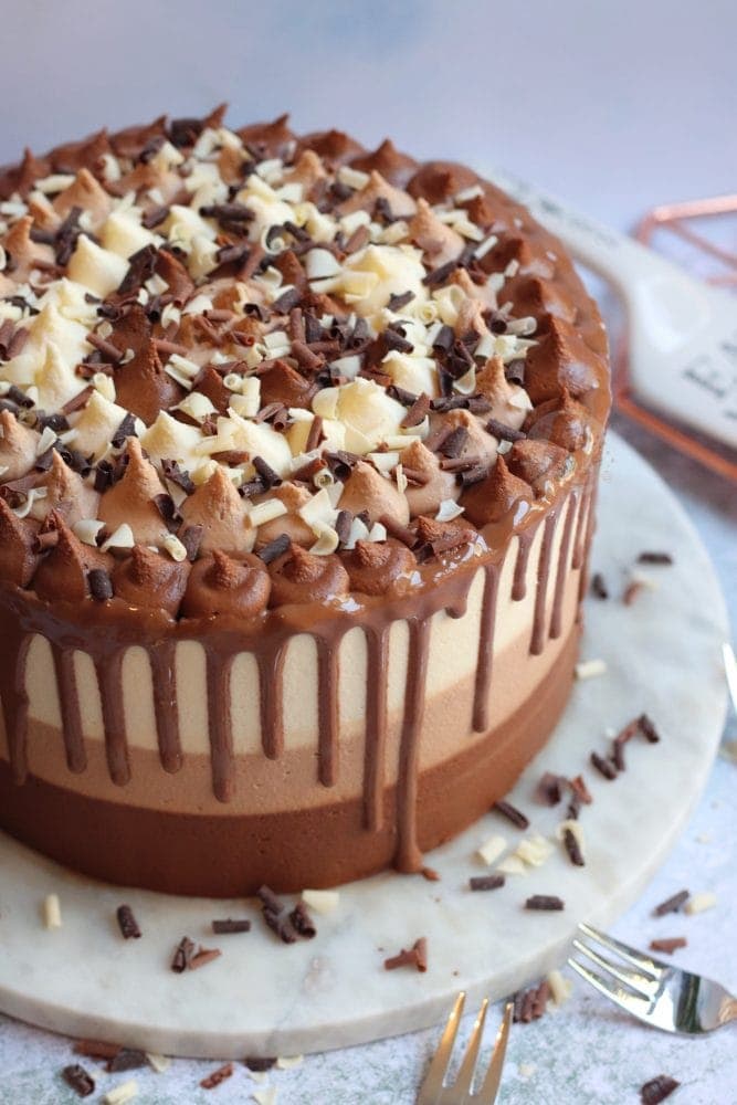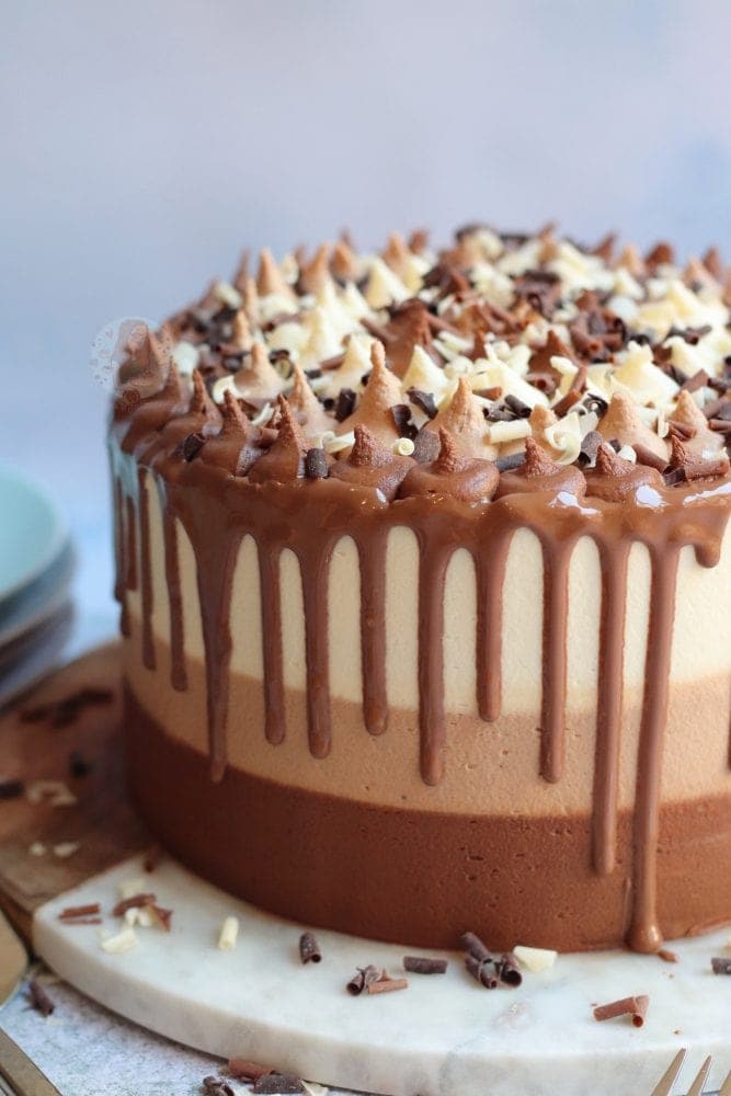 Triple chocolate cake with dark, milk and white layers and a chocolate drip!