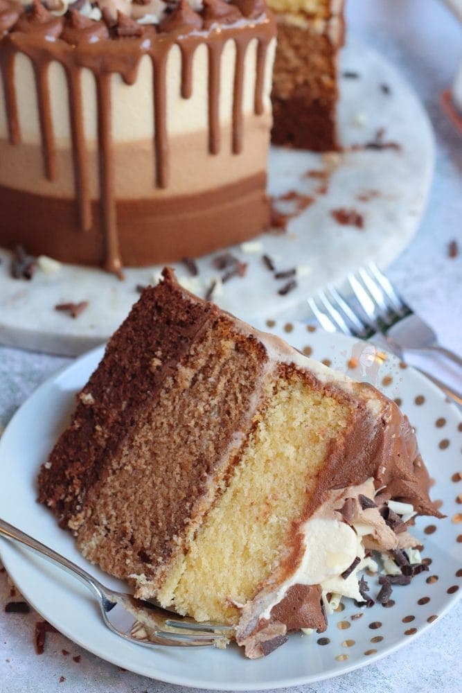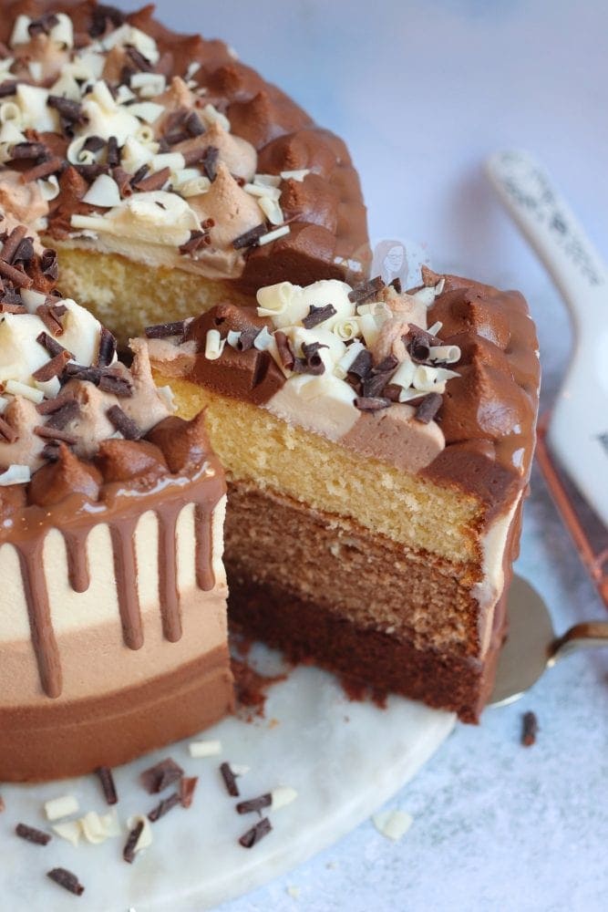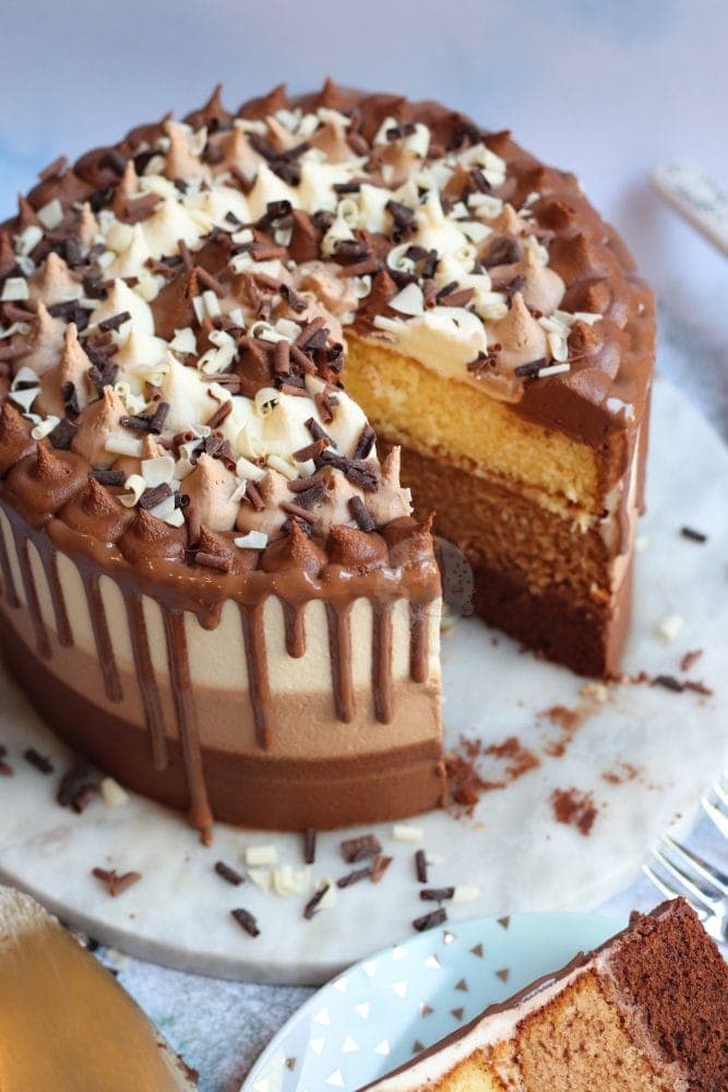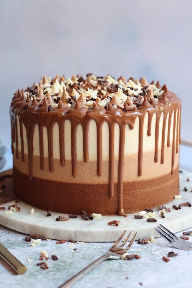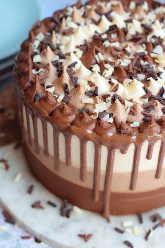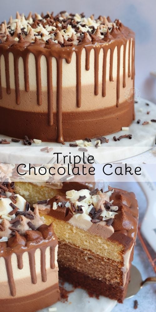 Triple chocolate cake with dark, milk and white layers and a chocolate drip!
