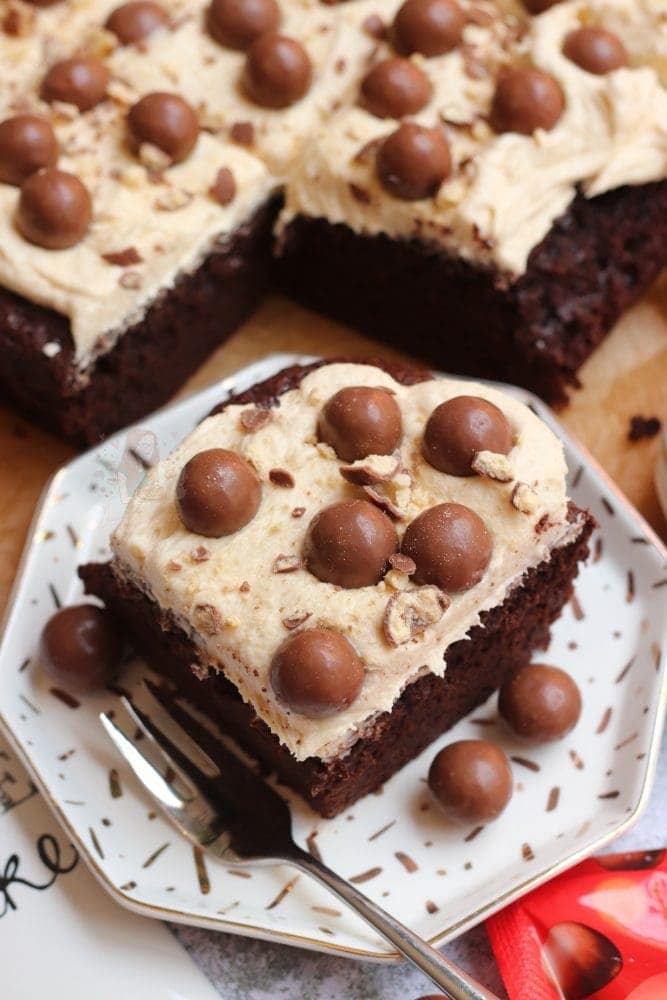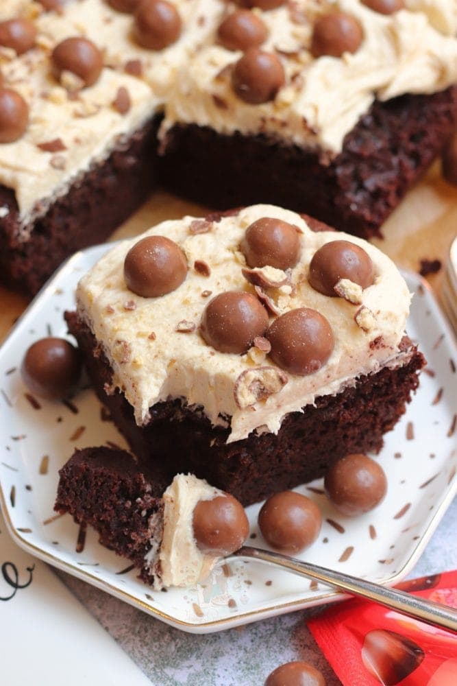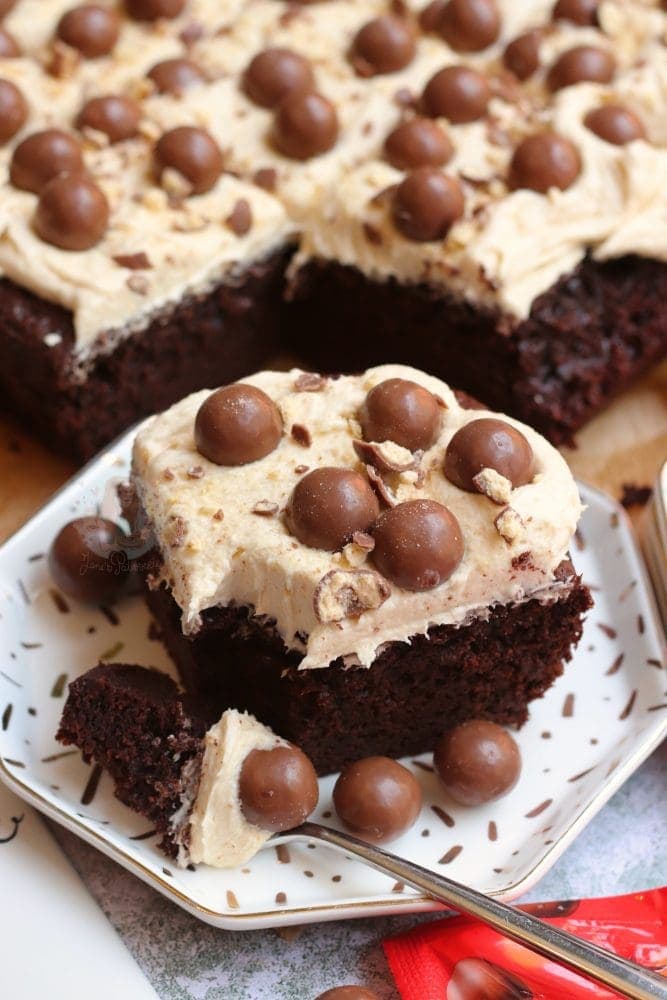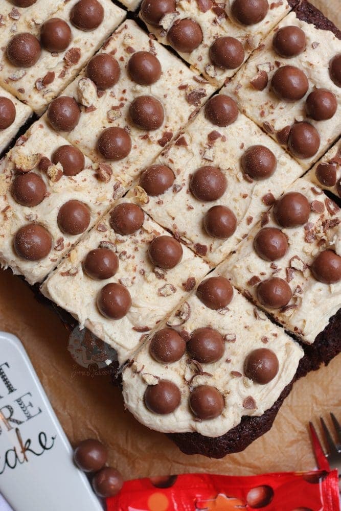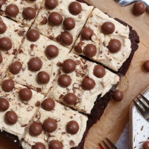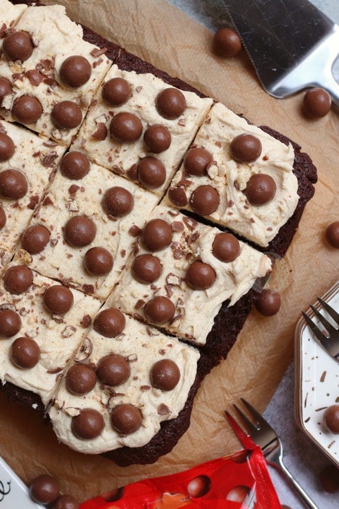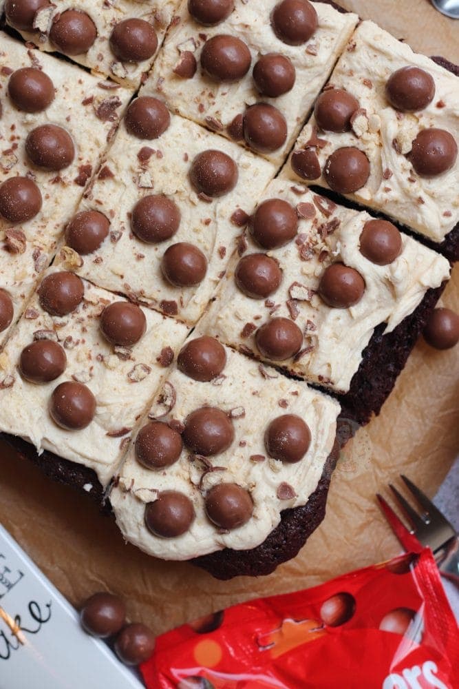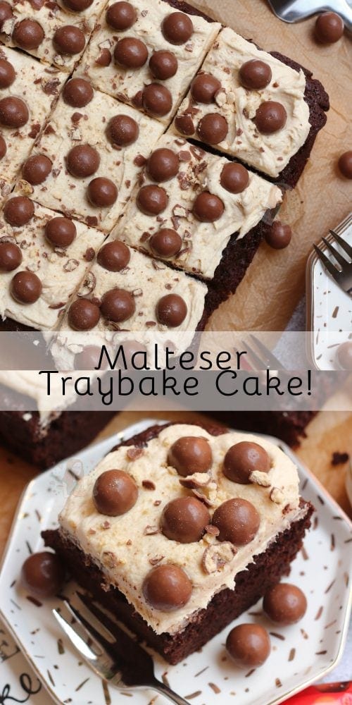 Thick and fudgey Malteser traybake cake with a malt fudge sponge, malt buttercream frosting and Maltesers!