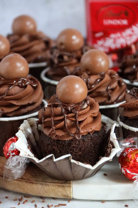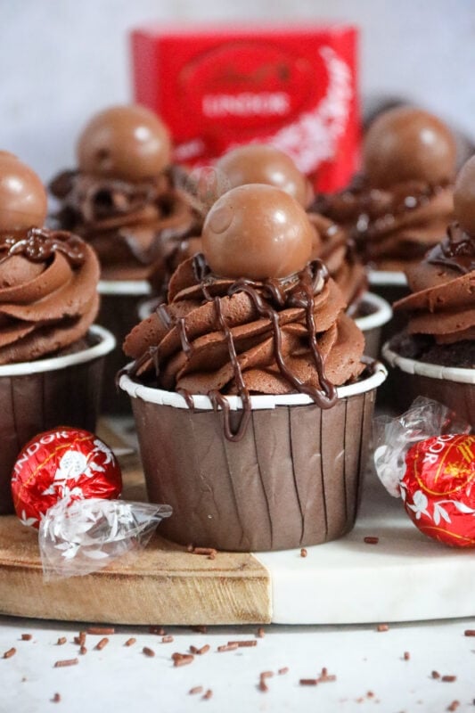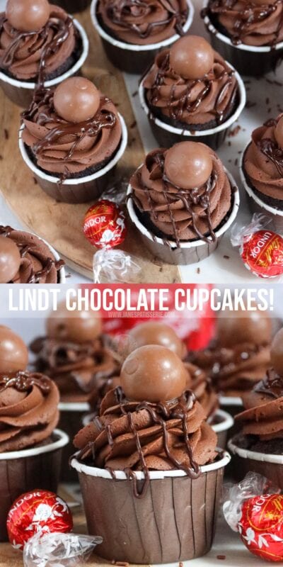 Rich Lindt chocolate cupcakes with a Lindt chocolate centre, Lindt chocolate buttercream frosting, and a Lindor truffle! Perfect Lindt chocolate cupcakes!