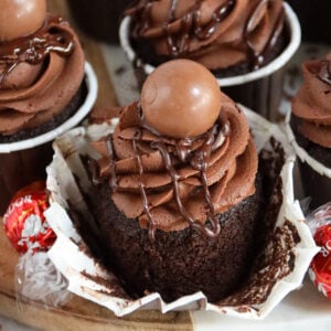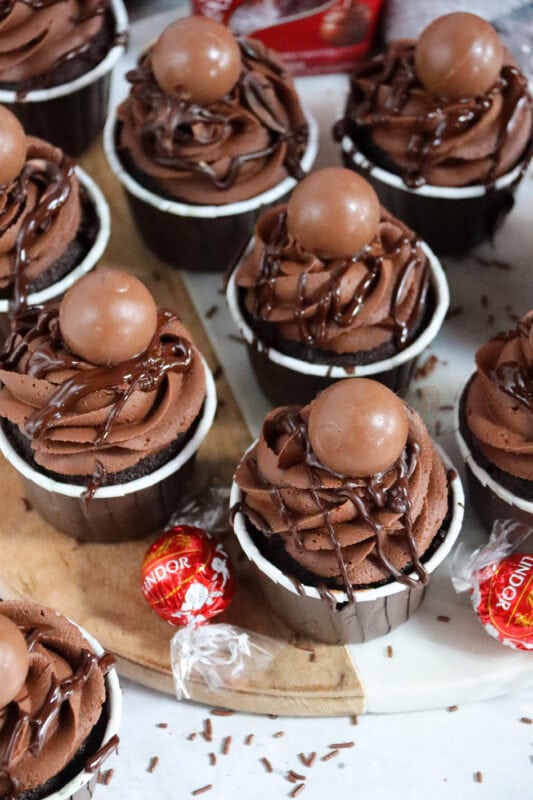 - Once made, pipe your buttercream onto your cupcakes, and add a Lindt Lindor truffle to the top of each cupcake!