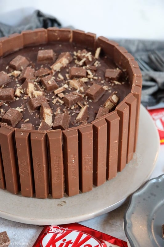 Regardless of how it looks, there is actually minimal decoration with this cheesecake as I wanted the shelled outer layer to be the appeal here! I just used some broken Kitkat fingers and some Kitkat bites you can get in share bags and popped them in my ganache to give the sunken look. I also crushed a few Kitkat fingers to get my ‘wafer dust’ I then added to the ganache also.