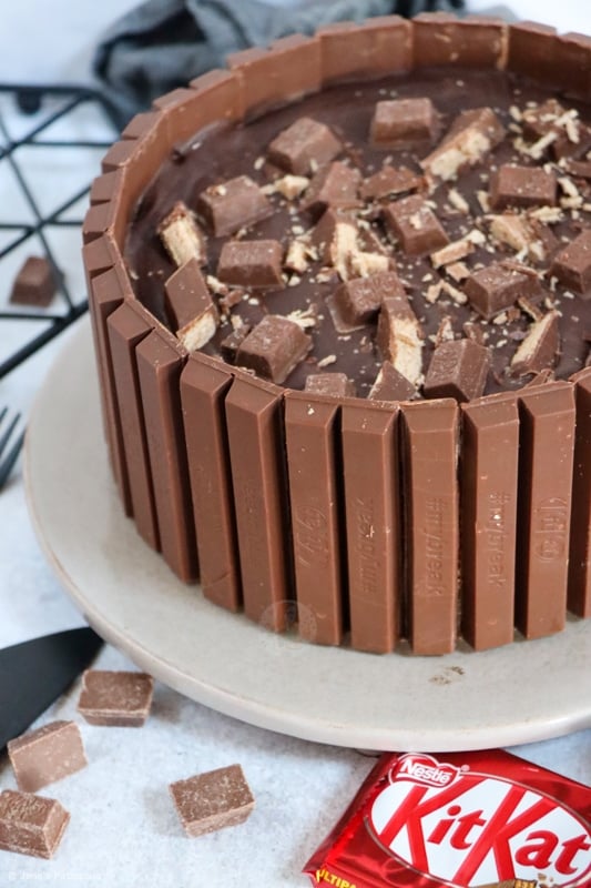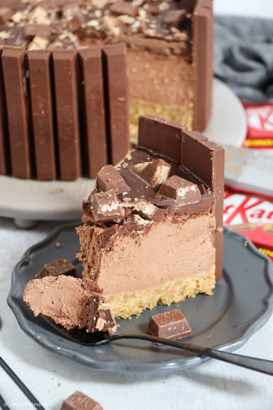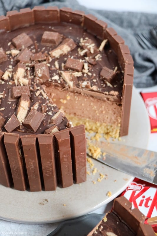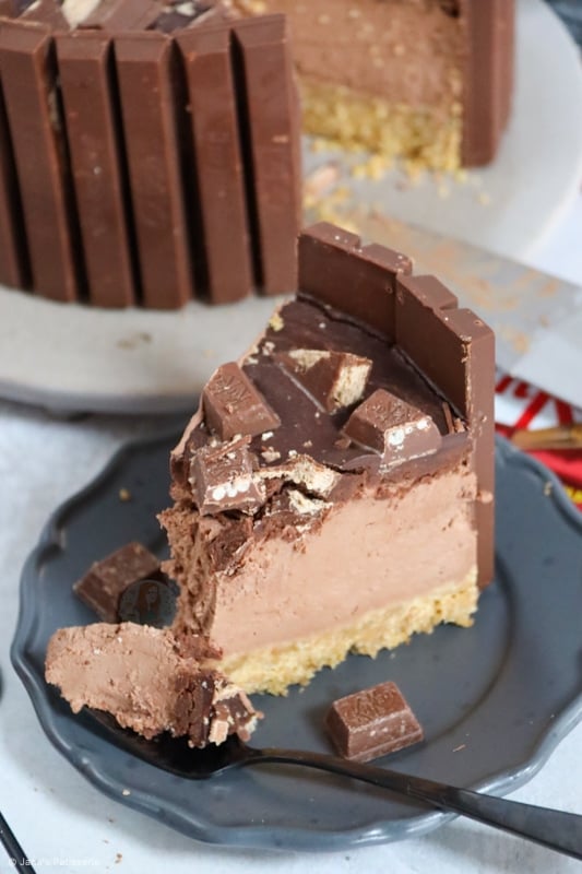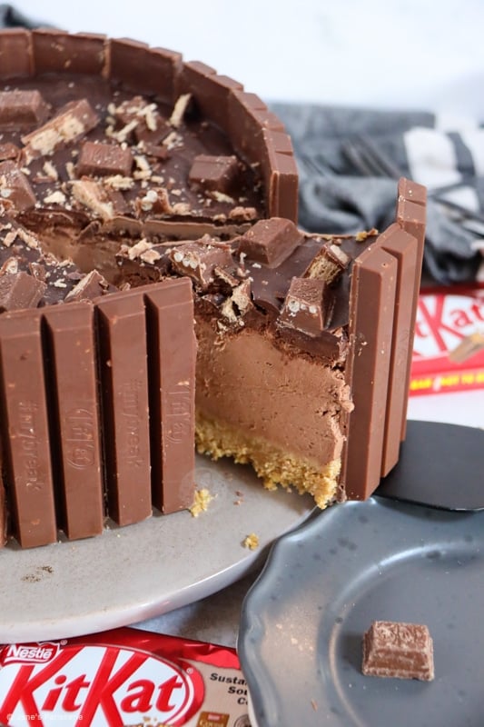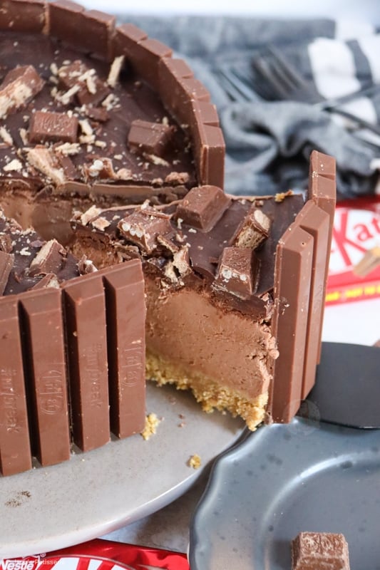 Easy no-bake chocolate KitKat cheesecake with a biscuit base, chocolate cheesecake filling, ganache topping and KitKat shell!