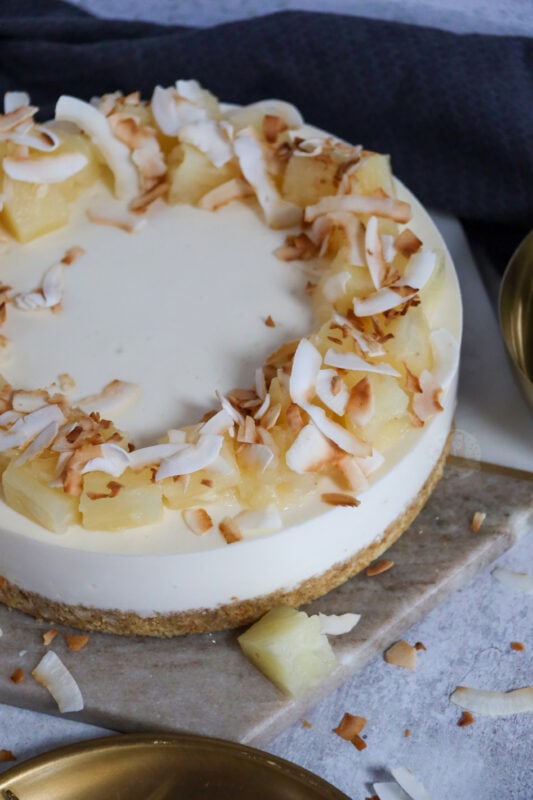 A coconut, pineapple and rum based piña colada cheesecake with a coconut and biscuit base, and pineapple and coconut on top!