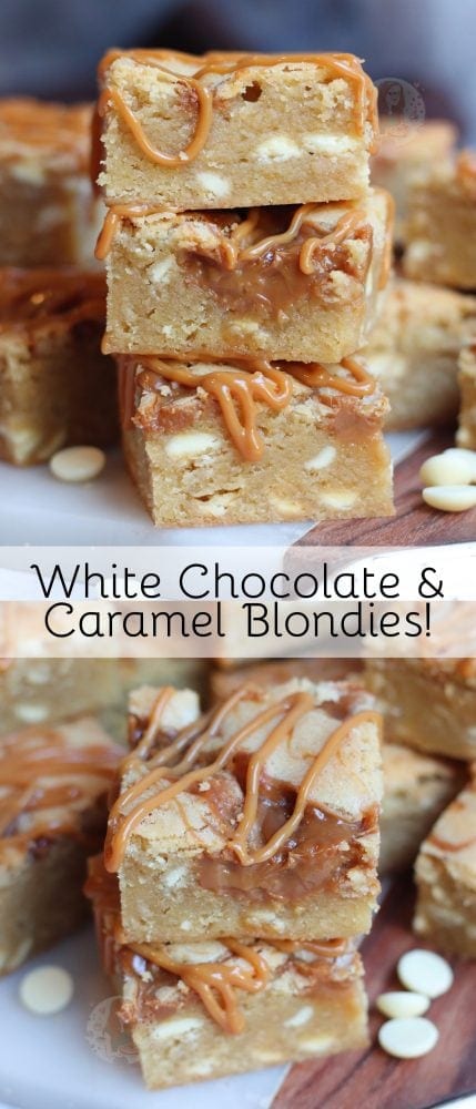Easy and delicious white chocolate & caramel blondies with caramel sauce and white chocolate chips!