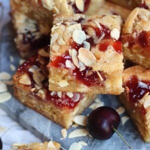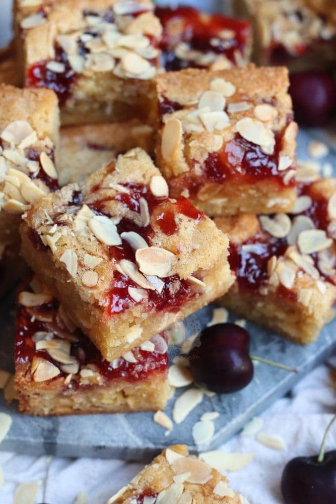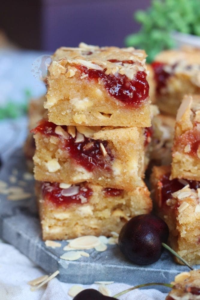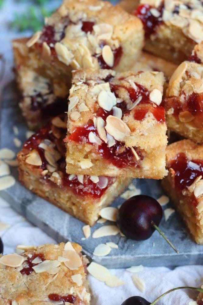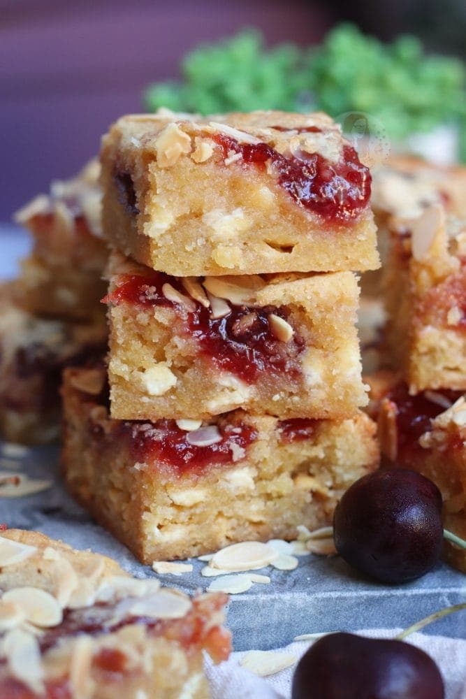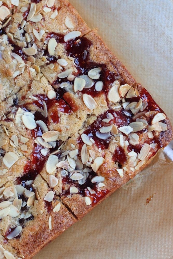 Almond and jam… a delicious combination. Usually there is a pastry base, a jam layer, and almond filling, and decoration on top. These blondies are basically the same, just without the pastry!