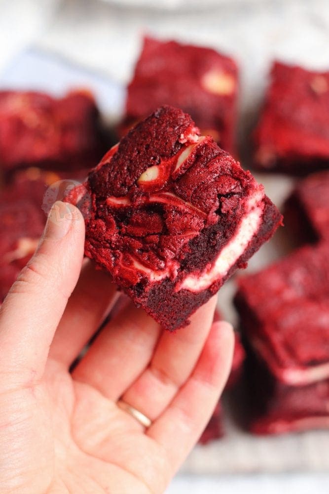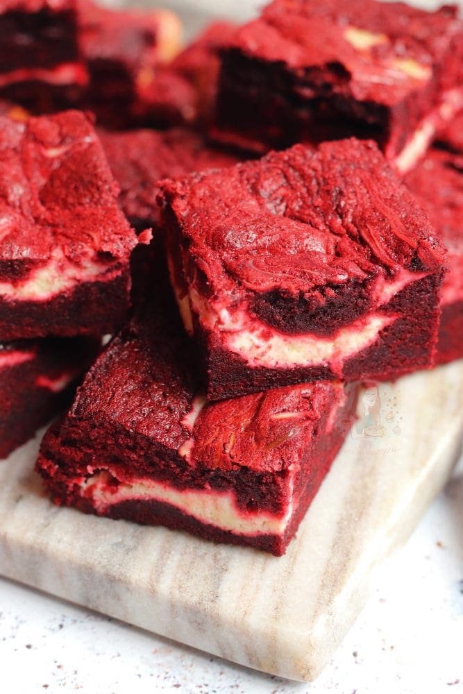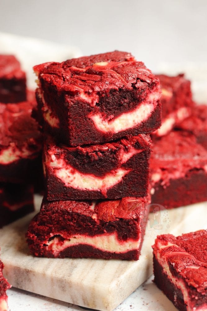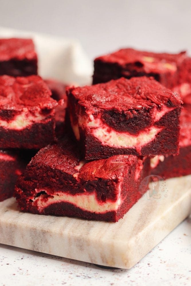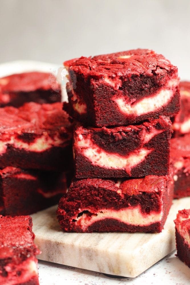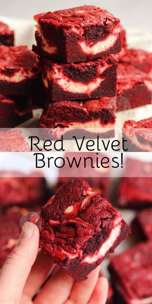Delicious red velvet brownies with a vanilla cheesecake swirl!