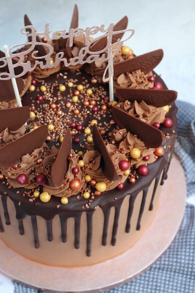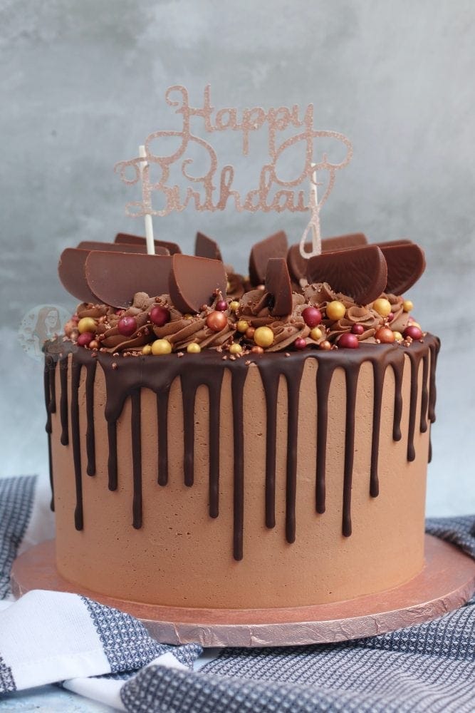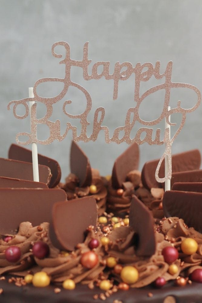 The Happy Birthday cake topper definitely does finish the cake off, and I just love it. The rose gold cake board was also a must, as I just love rose gold. I realise I have said that a few times now, but I love this cake! Make sure to check out my Terry’s chocolate orange cake for the cake recipe, the Biscoff drip cake for tips on the ganache, and if you have a go, enjoy!