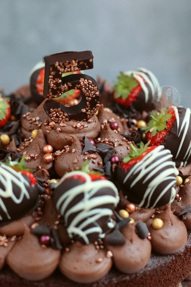 I then decorated the cake with some chocolate covered strawberries because I adore them – and then also some beautiful sprinkles! The Chocolate five is just some bronze sprinkles in a number mould, with chocolate set on top!