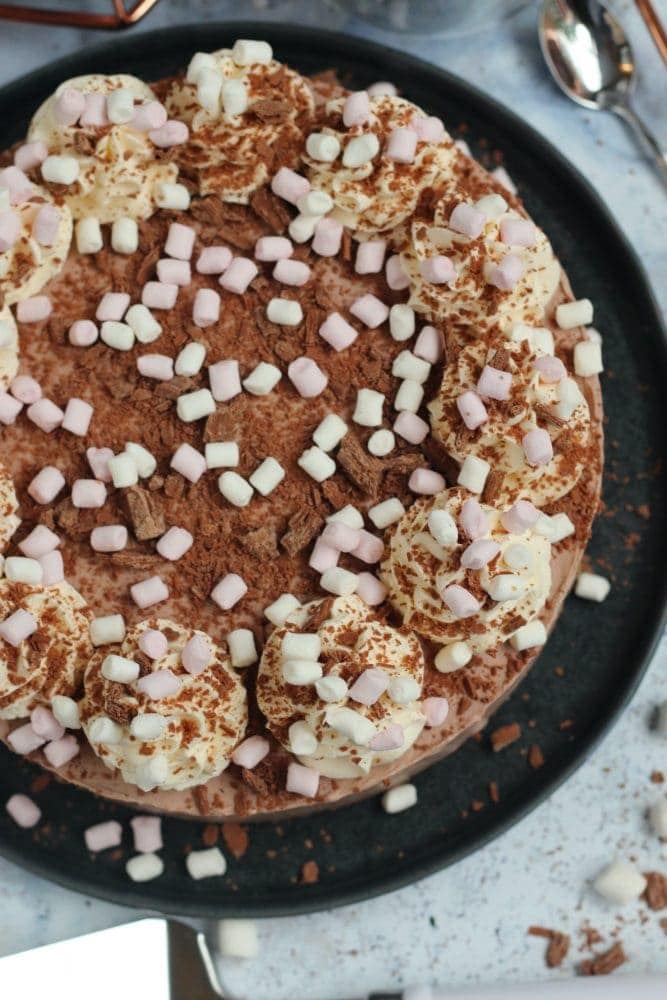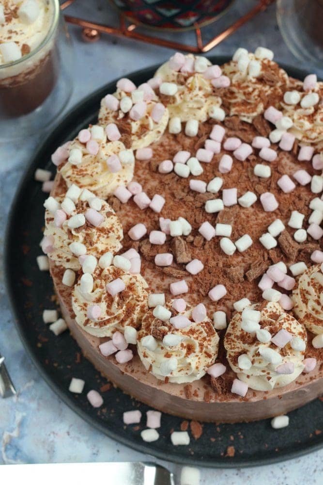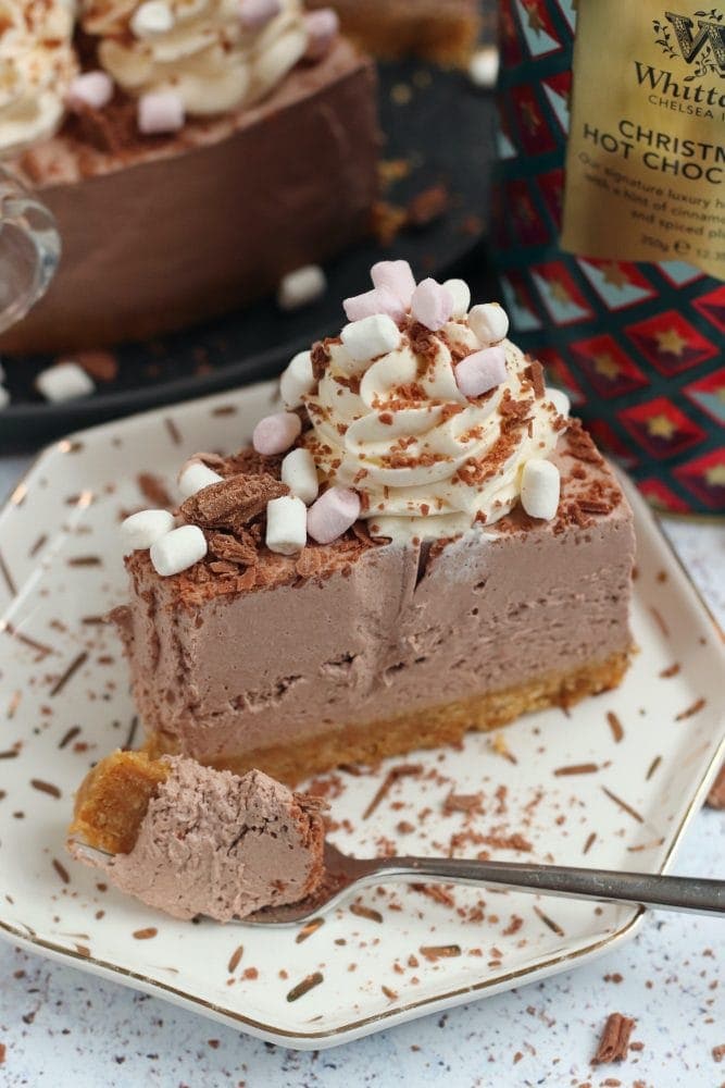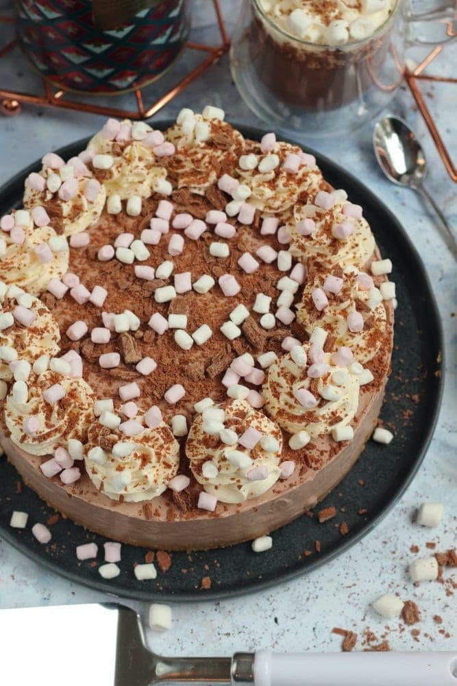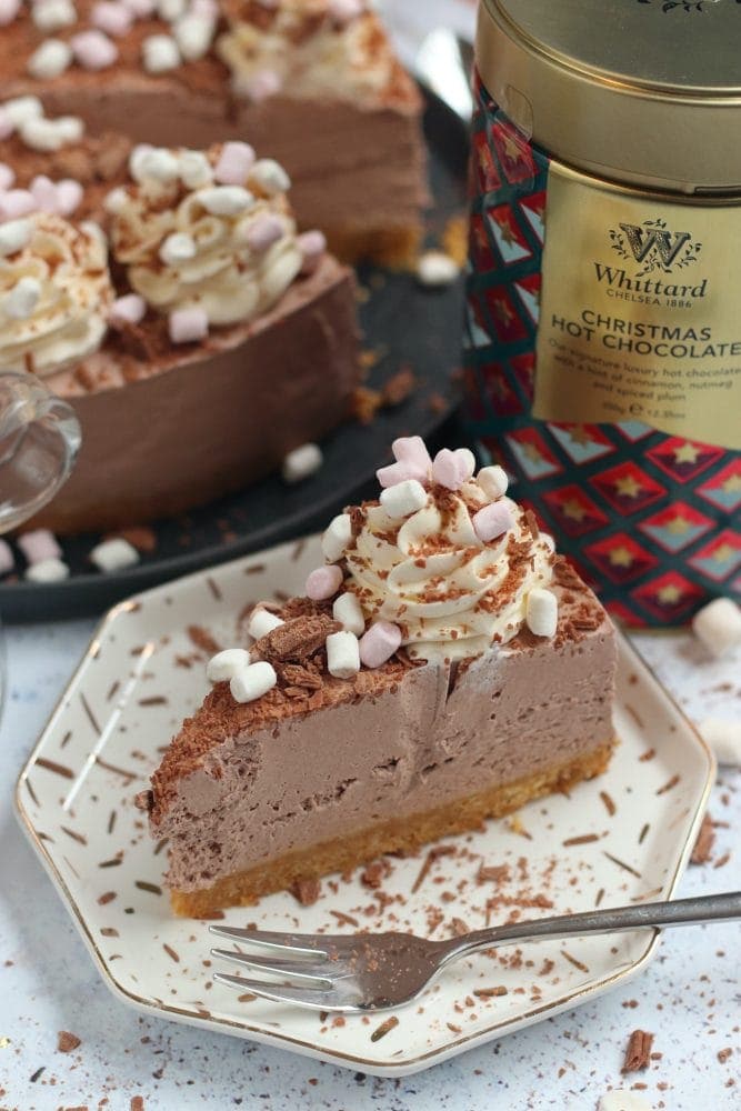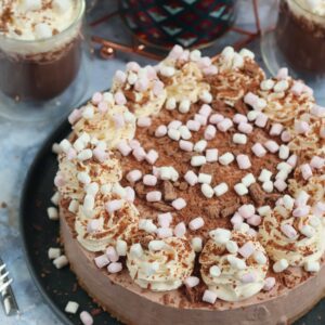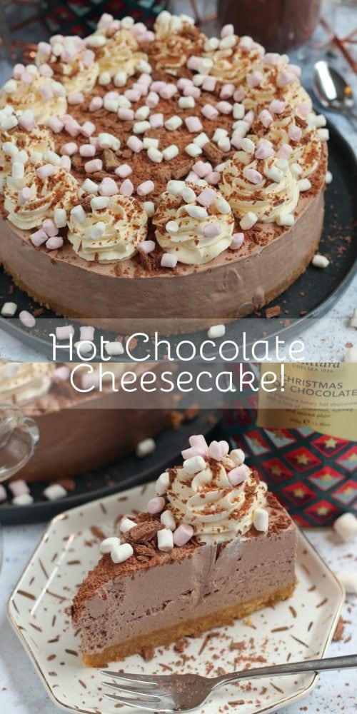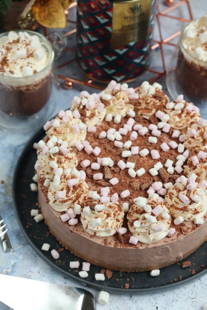 A delicious and creamy hot chocolate cheesecake with a buttery biscuit base, hot chocolate cheesecake filling, whipped cream, and more!