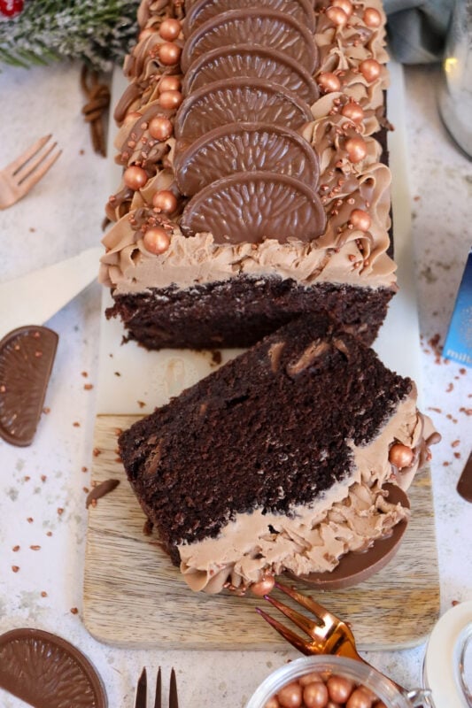 Due to how popular the loaf cake was, I knew I needed to do a Terry’s chocolate orange loaf cake… and just look at it! Look at the silky smooth Terry’s chocolate orange buttercream frosting, and the Christmas like sprinkles on top = heaven.