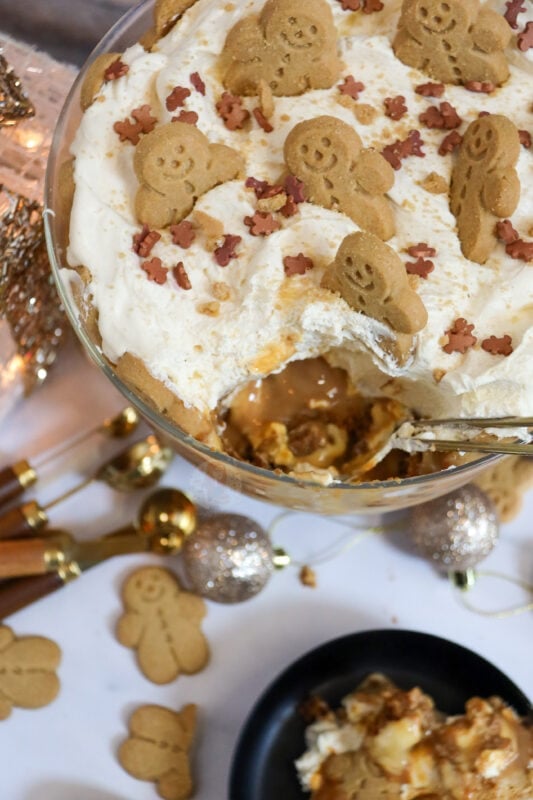 An easy gingerbread trifle with ginger cake, gingerbread, custard, ginger cream, caramel and more! Perfect no-bake dessert for the festive season!