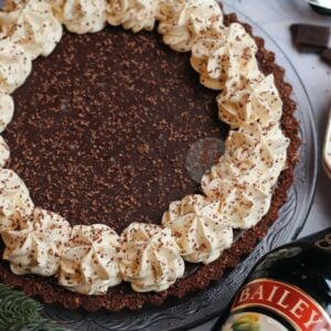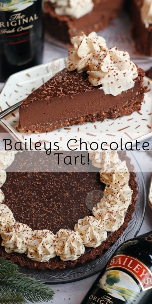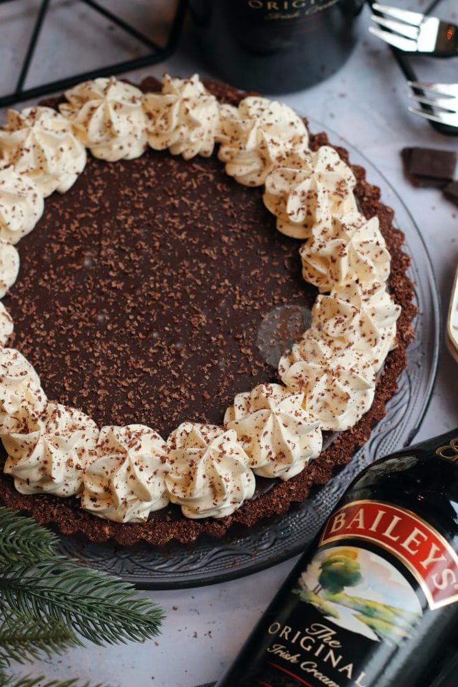 A rich and luxurious Baileys chocolate tart with a chocolate biscuit shell, rich Baileys chocolate ganache filling, and Baileys whipped cream on top!
