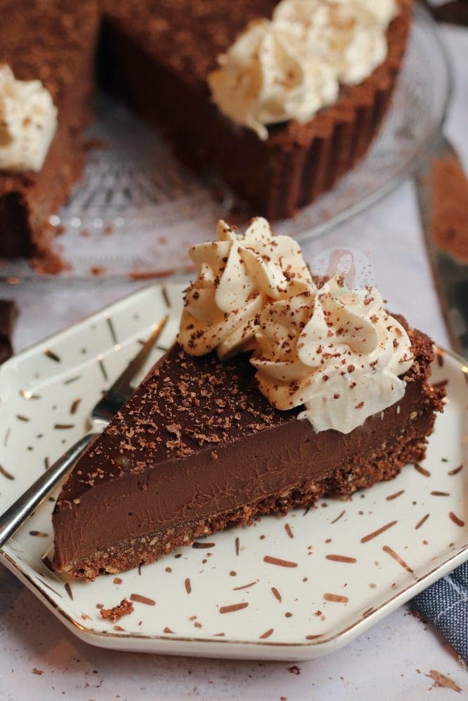 For the cream on top, it will be slightly softer than your regular whipped cream, but it still does pipe well – I think it looks good, and it tasted INSANE. Top that with some grated flakes of chocolate, and you are set! It doesn’t need too much more, and this tart will serve plenty as it’s so rich.