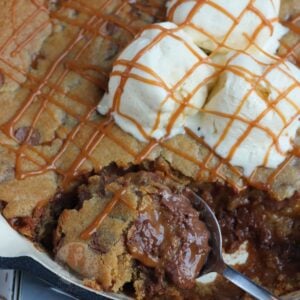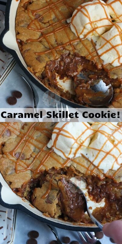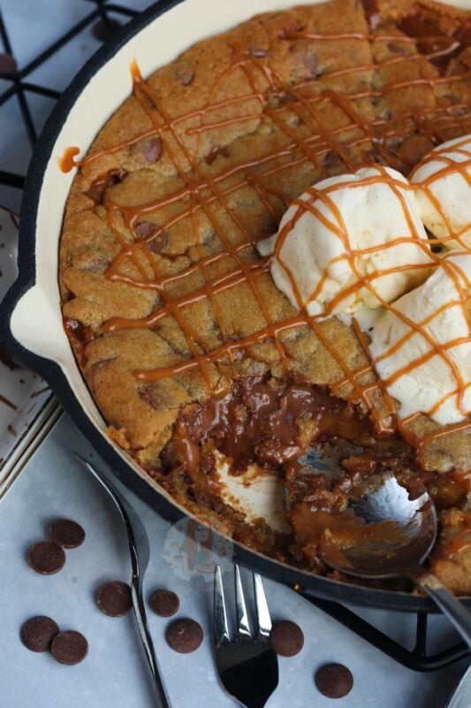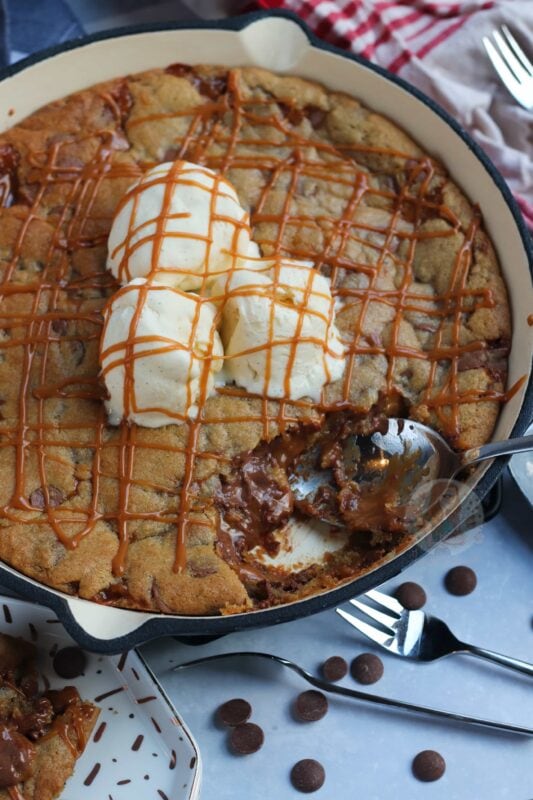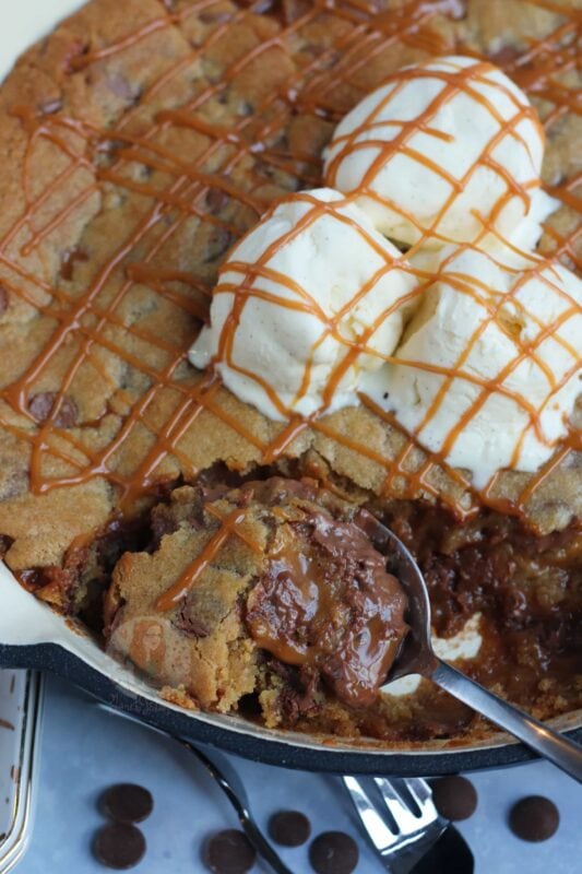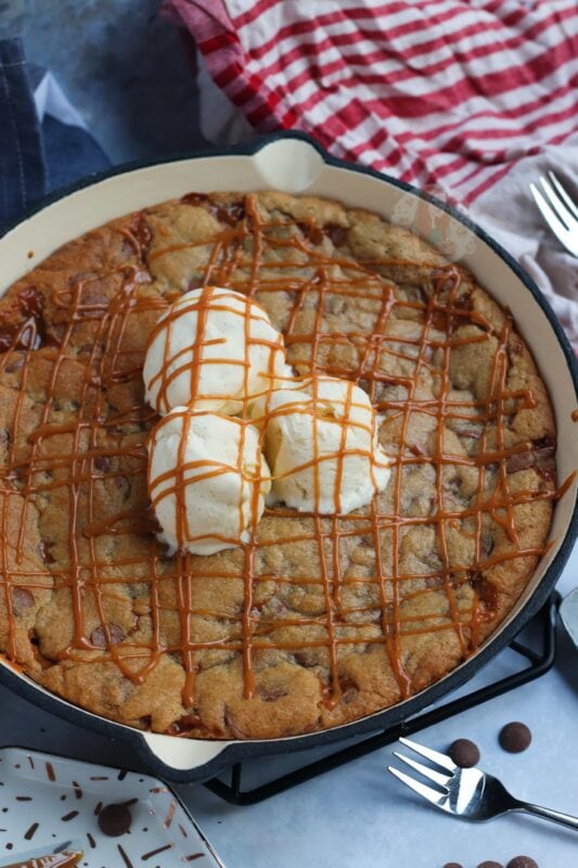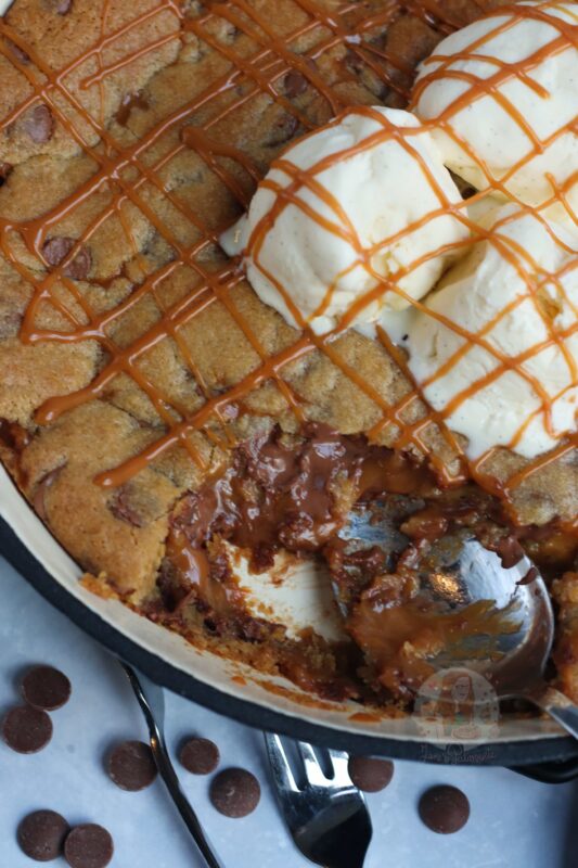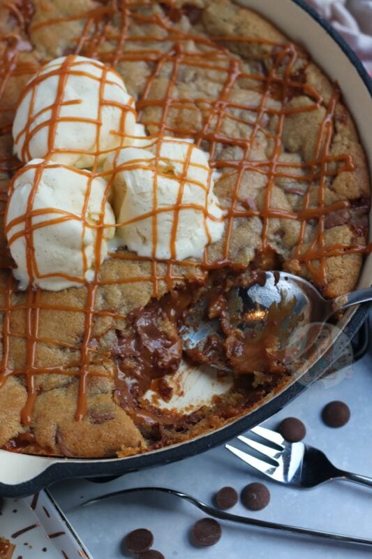 A gooey caramel skillet cookie with chocolate chips and a caramel centre – perfect served with a caramel drizzle and some vanilla ice cream!