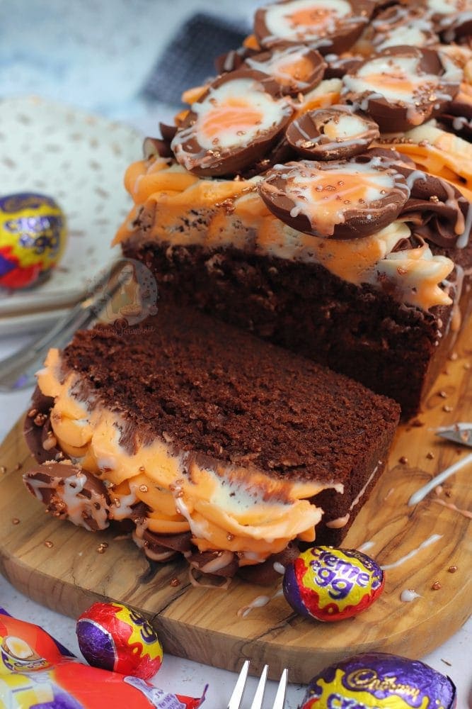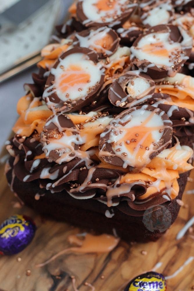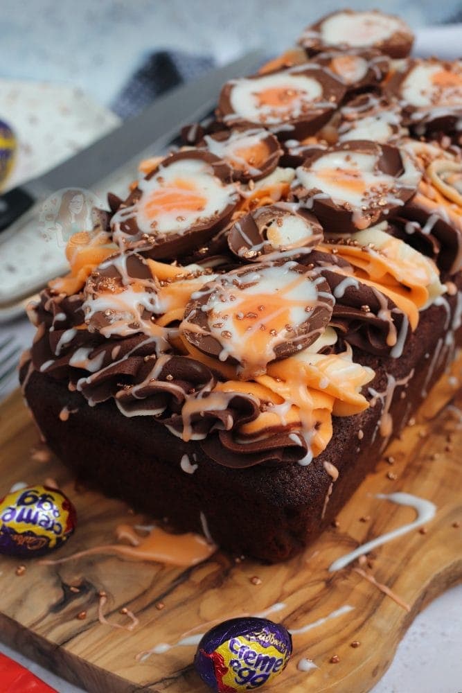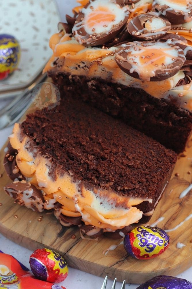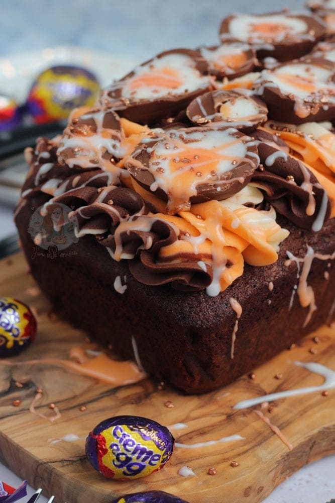 An easy Creme Egg loaf cake with a chocolate sponge, Creme Egg themed buttercream, and Creme Eggs! Easter heaven!