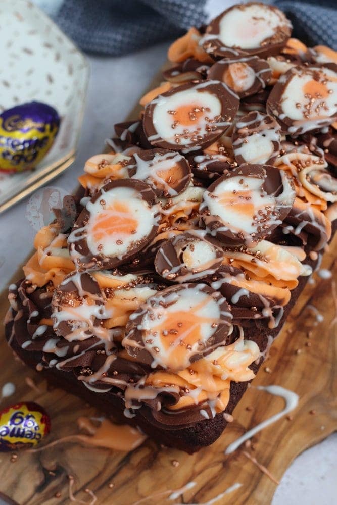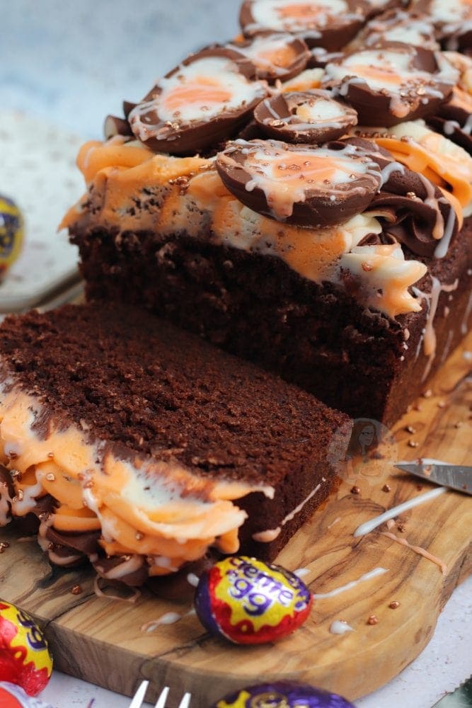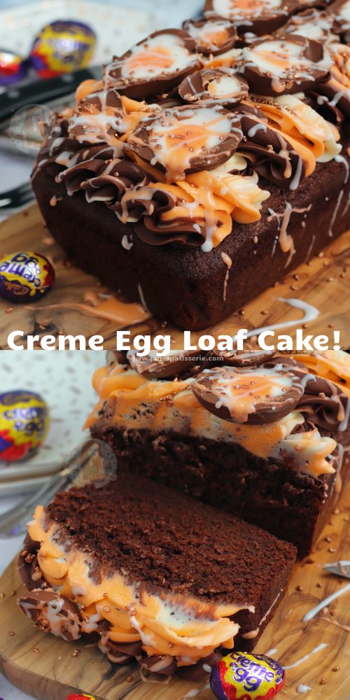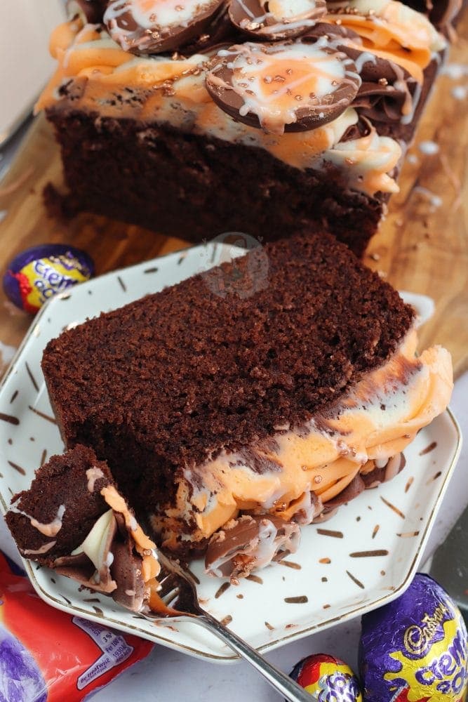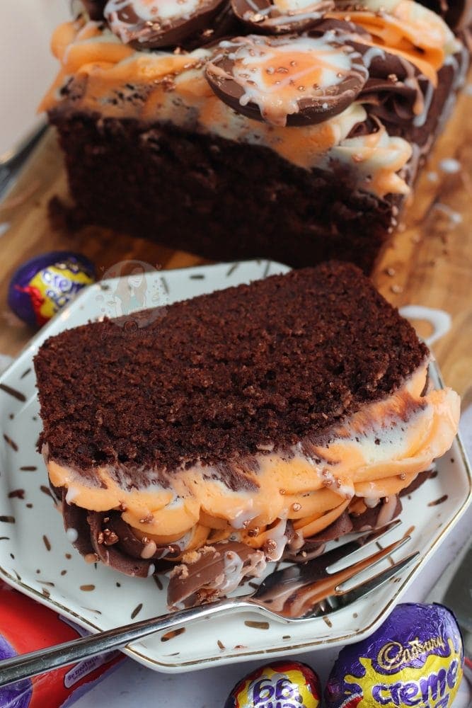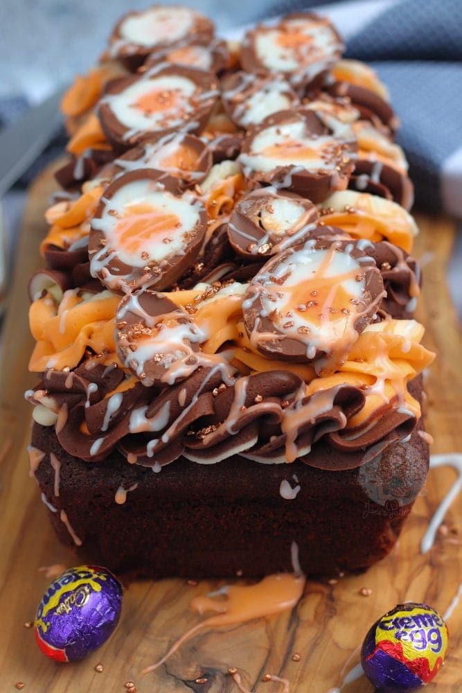 An easy Creme Egg loaf cake with a chocolate sponge, Creme Egg themed buttercream, and Creme Eggs! Easter heaven!