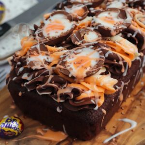 I used three larger creme eggs, and three mini Creme Eggs because loaf cakes aren’t actually that large, some of my favourite bronze crunch sprinkles, and then a drizzle of basic water icing to resemble the insides of the Creme Egg. I hope you love this recipe! Happy baking! X