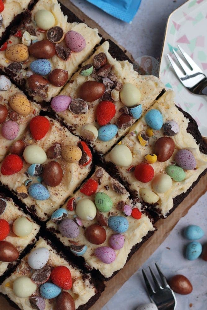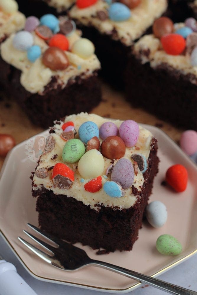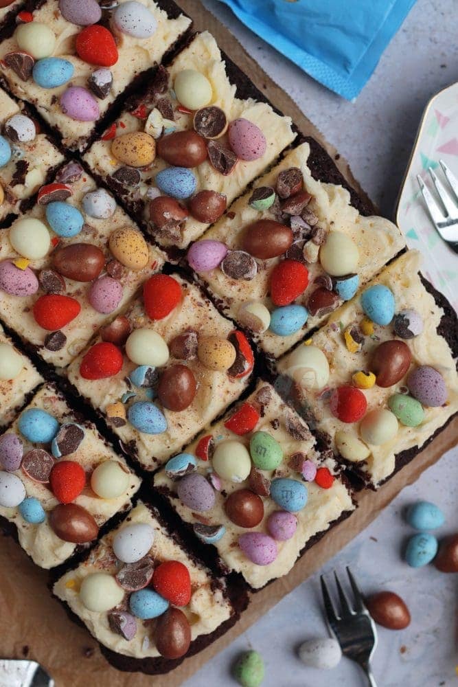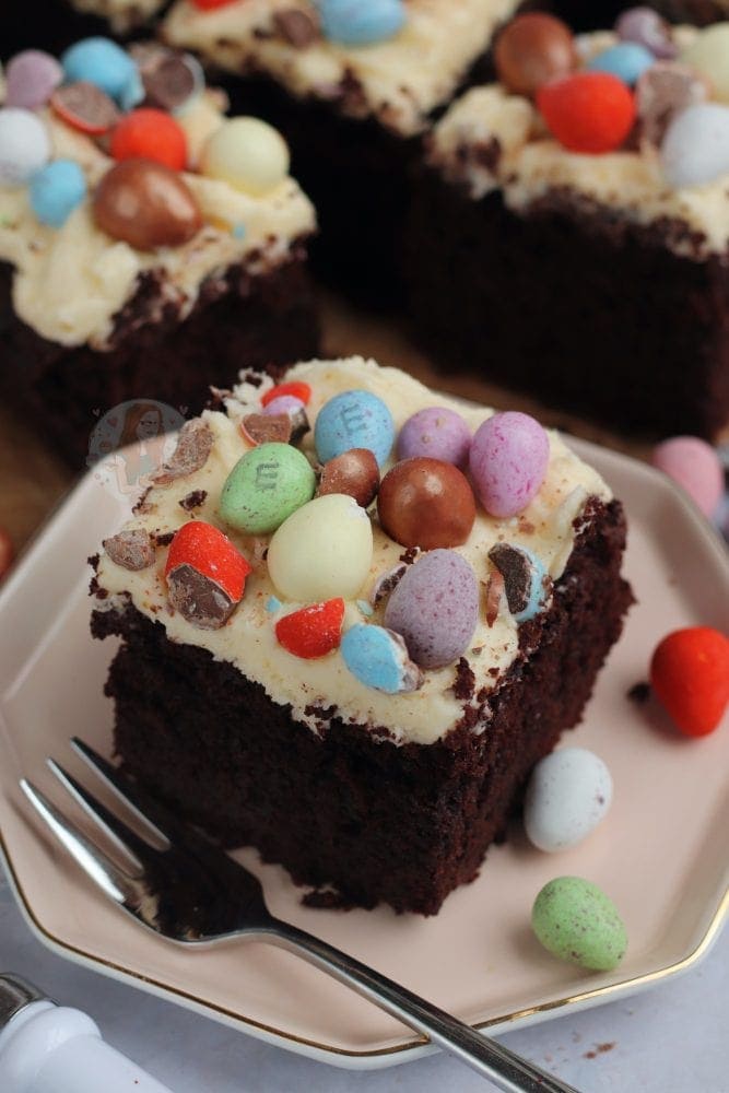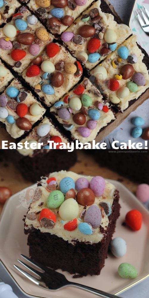 A fudgey delicious chocolate Easter traybake cake with vanilla buttercream frosting and ALL of your favourite Easter treats!!
