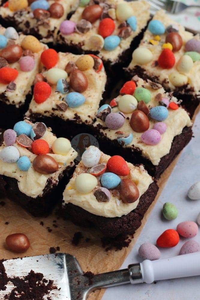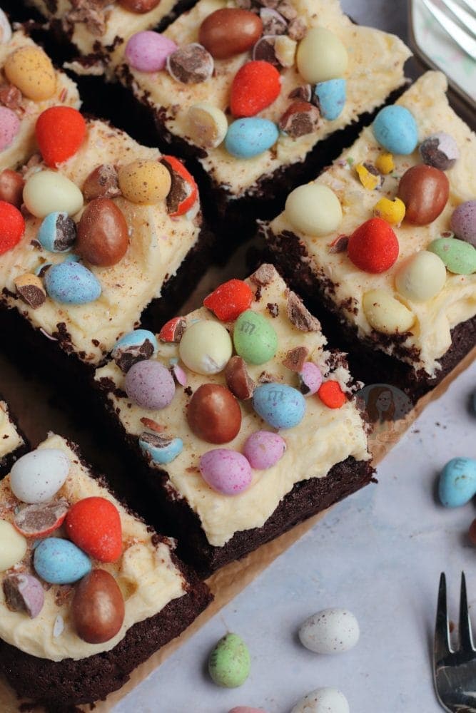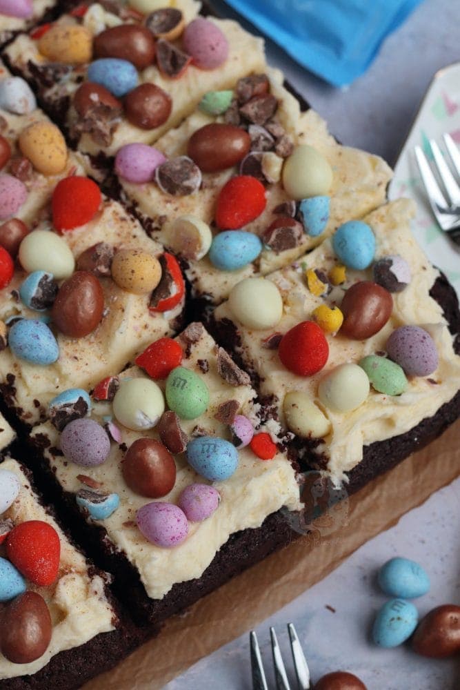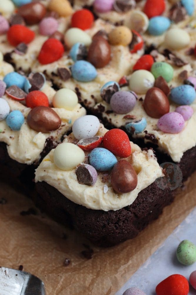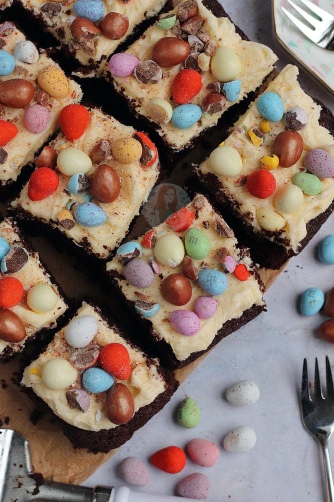 A fudgey delicious chocolate Easter traybake cake with vanilla buttercream frosting and ALL of your favourite Easter treats!!