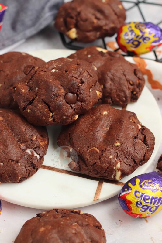 Today I give you the Creme Egg stuffed cookie. It’s a chocolate cookie dough, stuffed with triple chocolate chunks, and a whole creme egg, for every cookie. I realise it sounds like a lot, and in all honesty, it is… but it’s worth it.