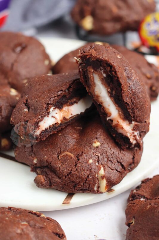 My Nutella stuffed cookies have always been a hit too – but let’s be honest, any spread can be used inside a cookie really. I’ve tried it with basically all spreads that I have found – and I needed to take it to the next level with Creme Eggs. Shall we all just appreciate how utterly delicious and scrumptious that they look?! Okay then.