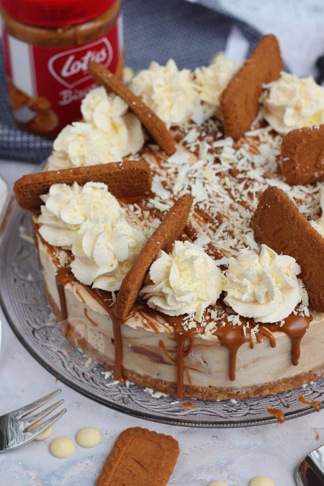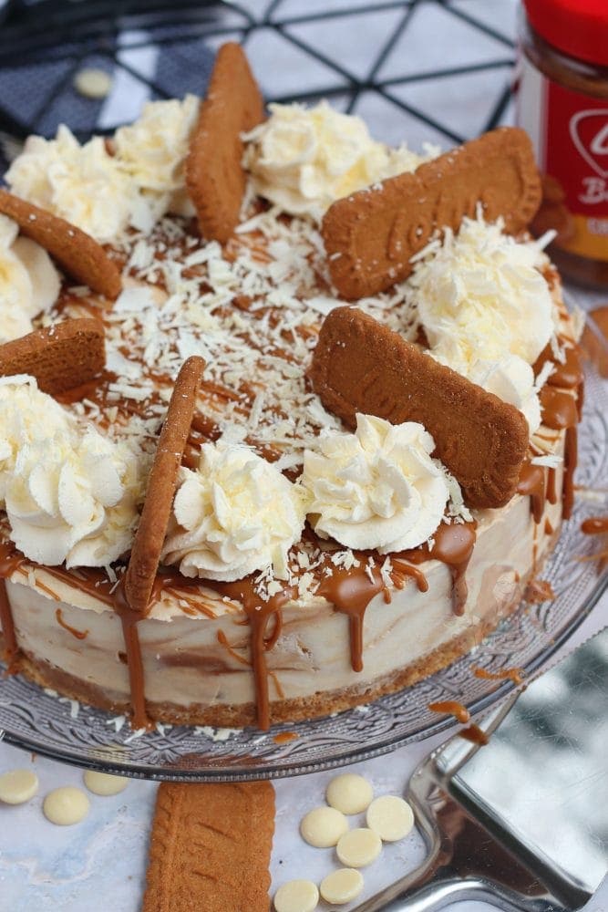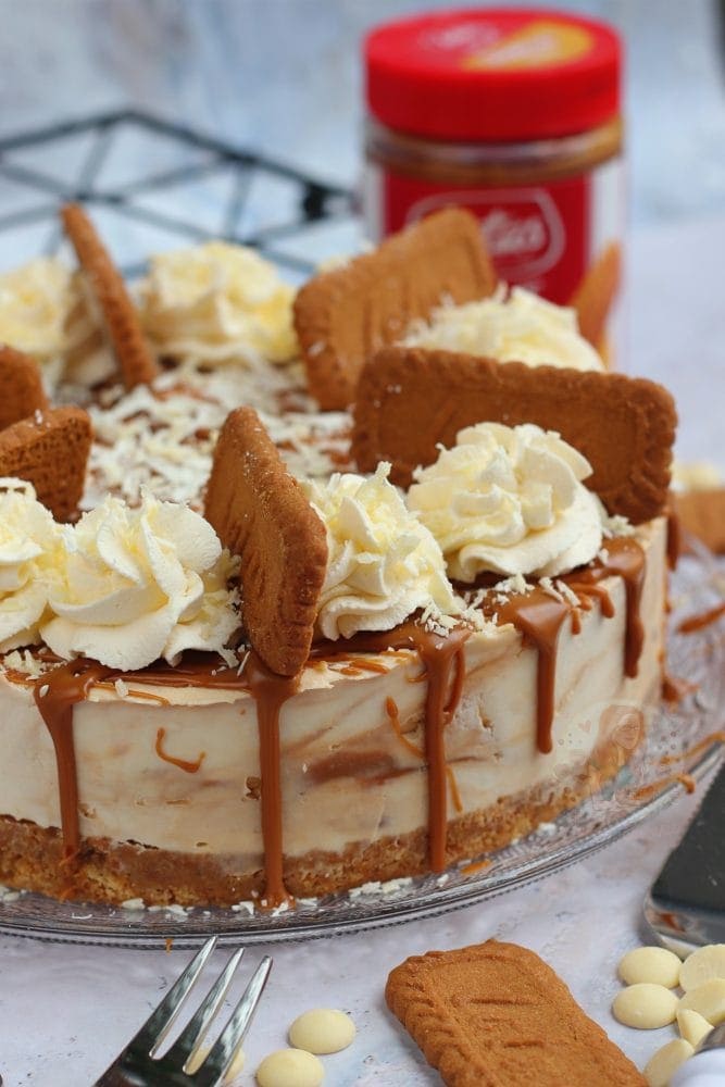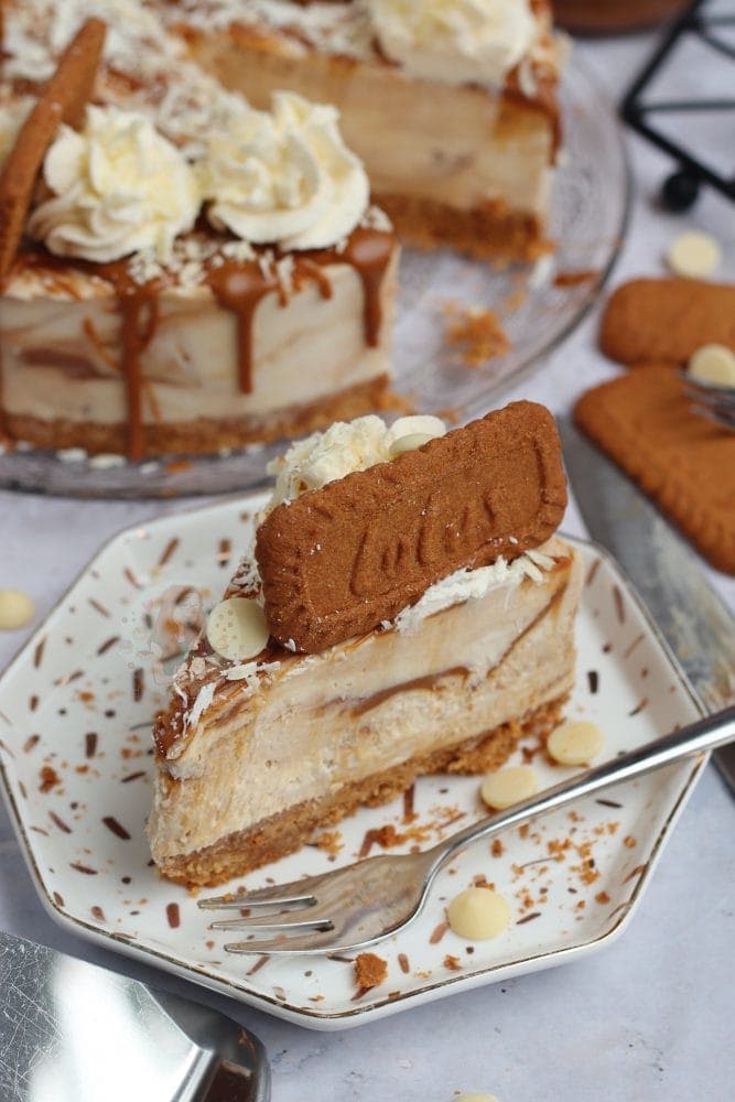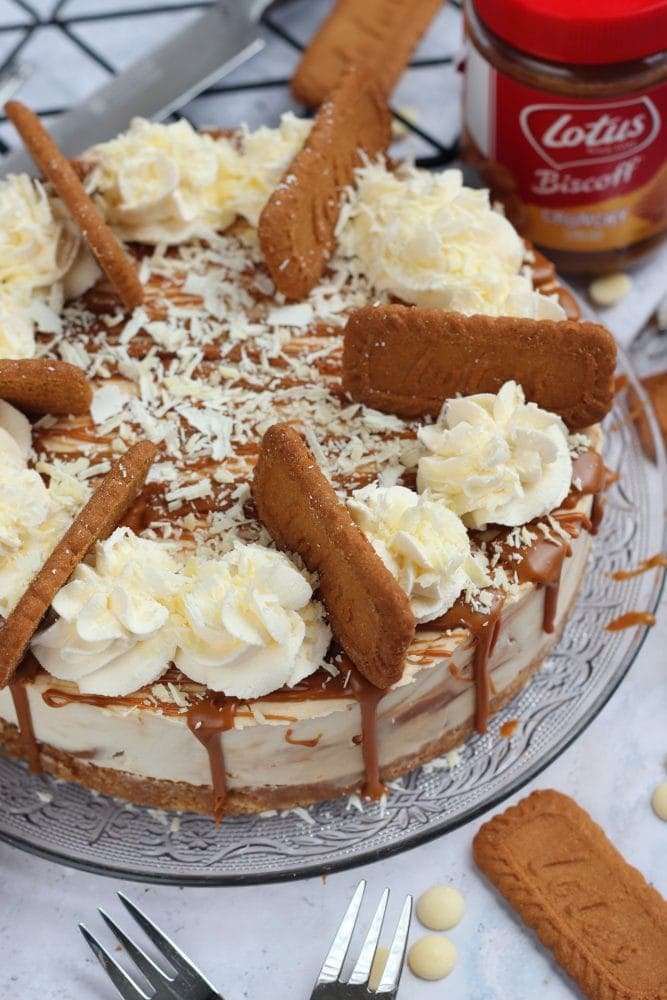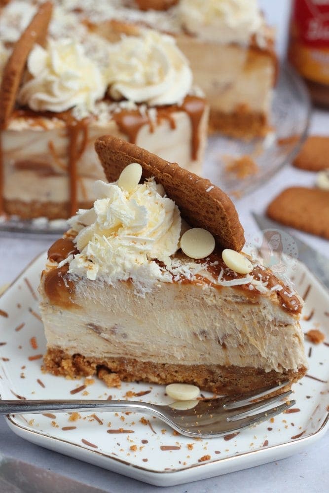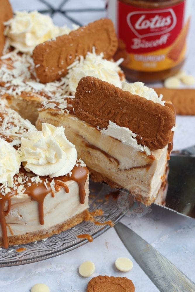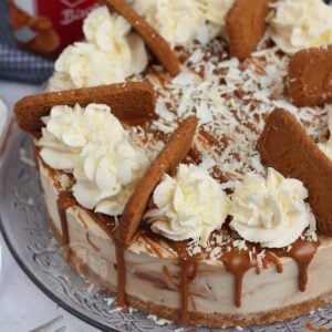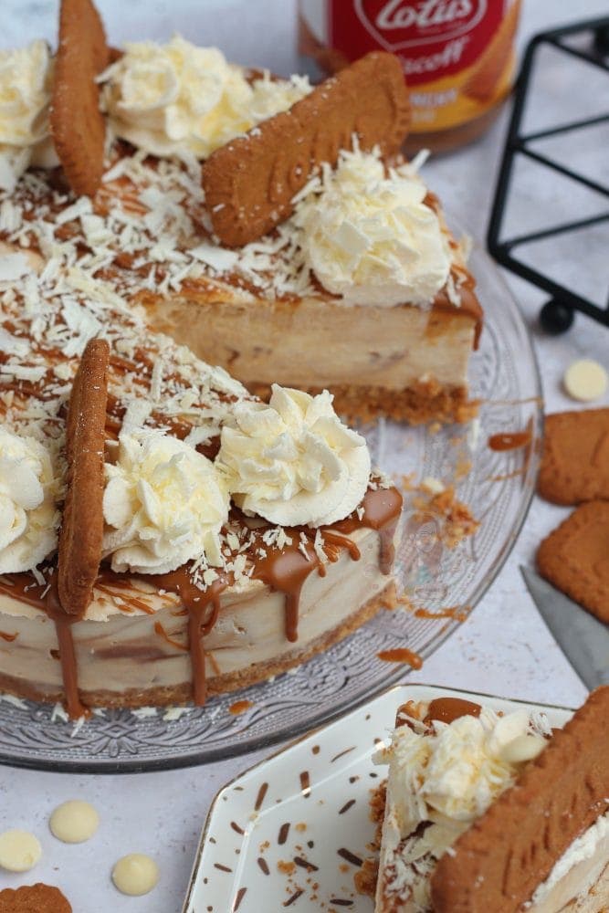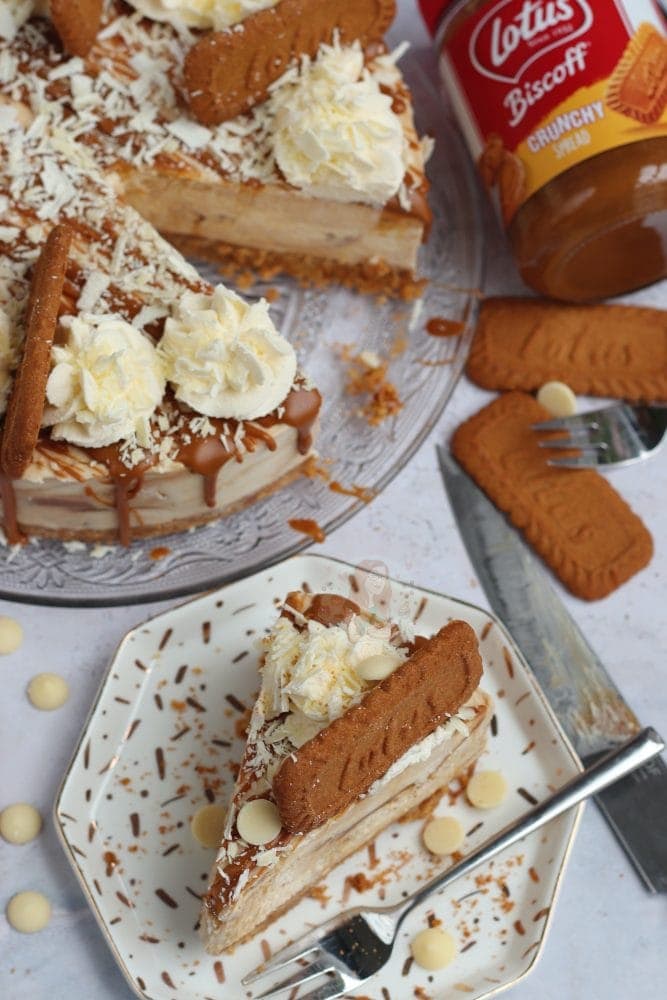 A delicious no-bake white chocolate and Biscoff swirl cheesecake with a buttery biscuit base, white chocolate cheesecake filling swirled with Biscoff spread, topped with whipped cream, and even more Biscoff!