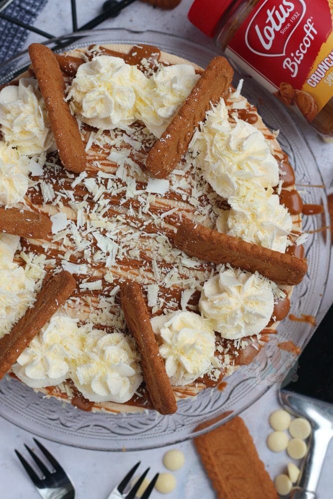 For the decoration, you can basically do whatever you fancy. I drizzled over some biscoff spread that I have microwaved for 20 seconds or so, then added some whipped cream, some white chocolate shavings, and the lotus biscuits!