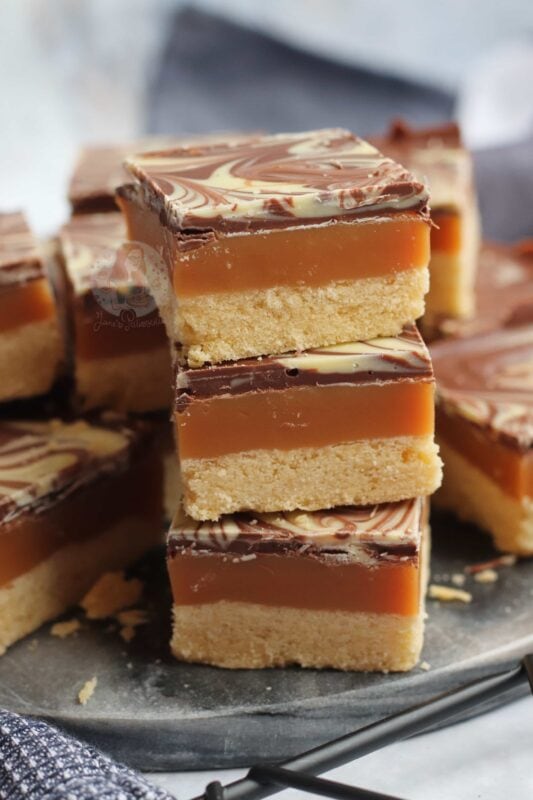 If you find once your millionaires shortbread is finished, that the caramel is rock solid and more like toffee, you overdid it slightly on the boiling. It’s best to keep and store it at room temperature from now on, so it’s at least not fridge cold hard. If your caramel is too soft, you didn’t do it for long enough, so should definitely be kept in the fridge.