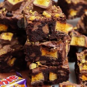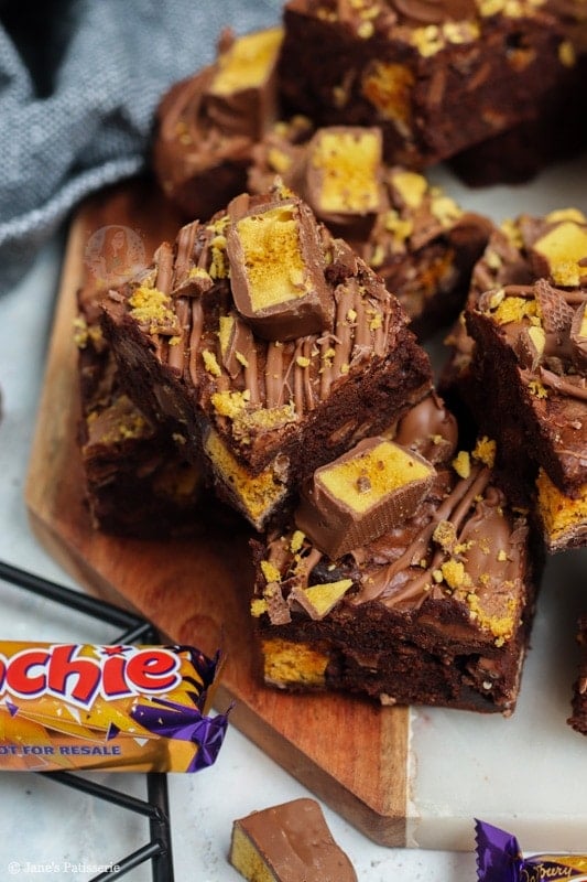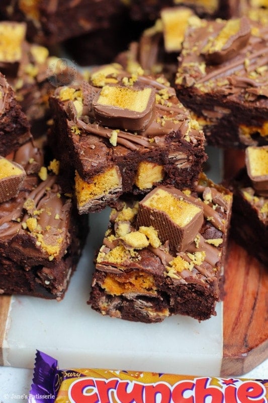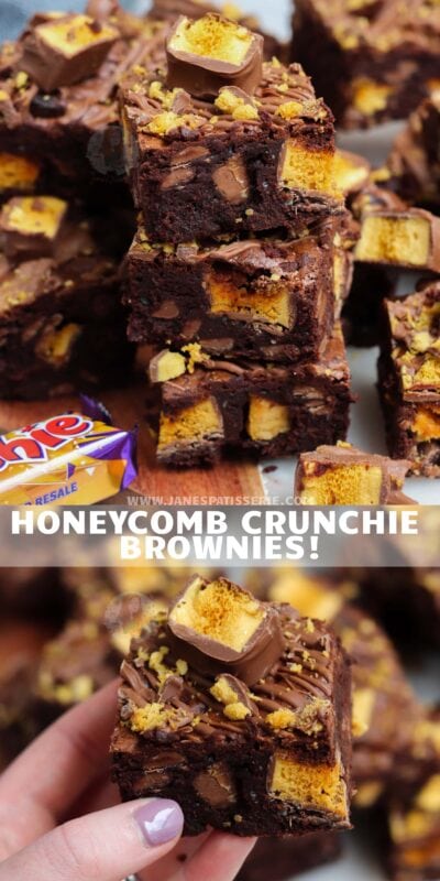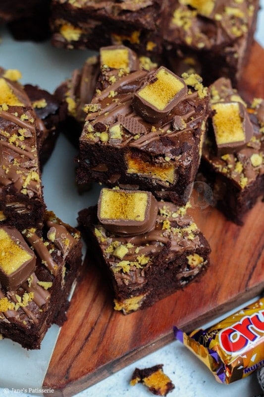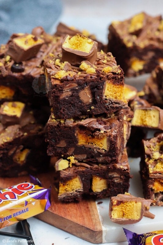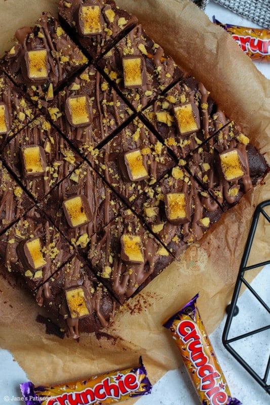 Easy and delicious super chocolatey honeycomb Crunchie brownies, stuffed with chocolate chips and Cadbury’s honeycomb Crunchie pieces!