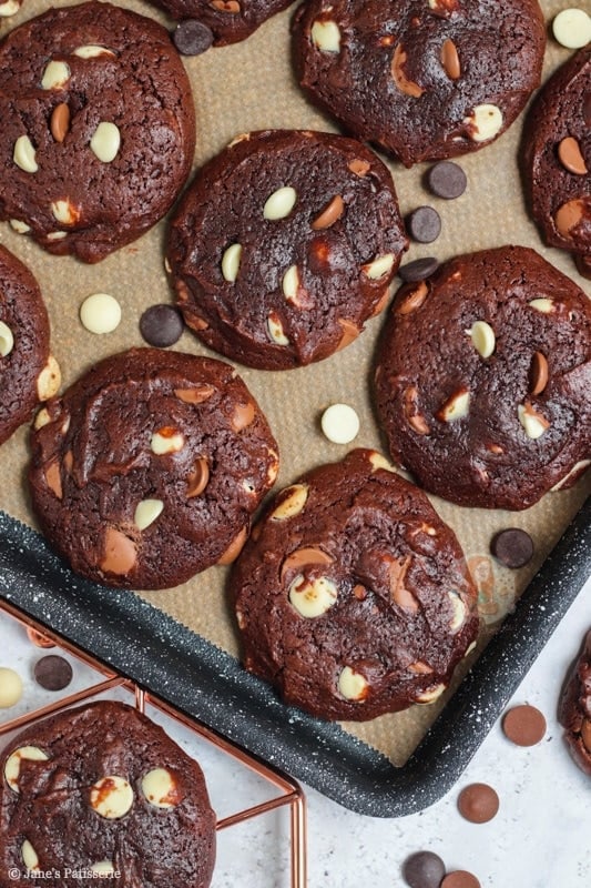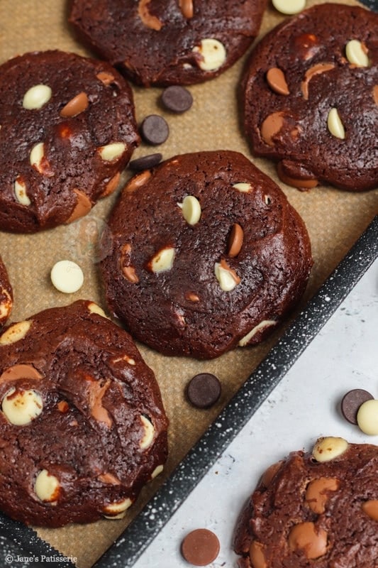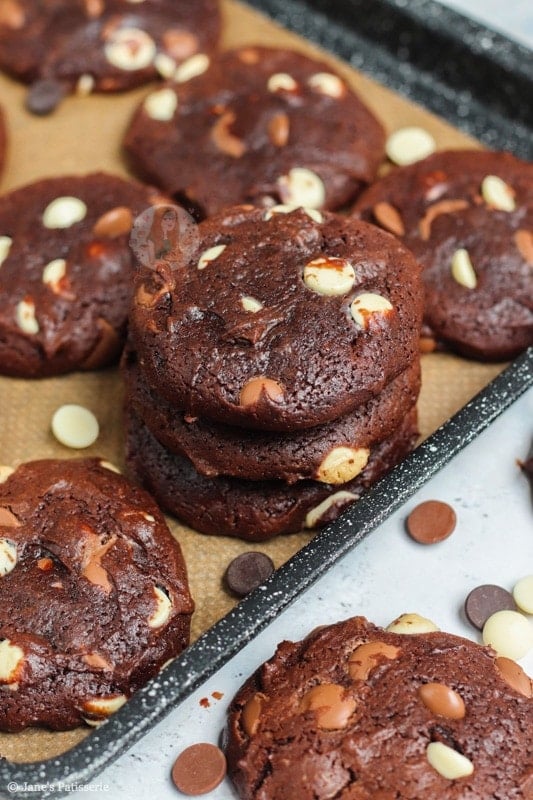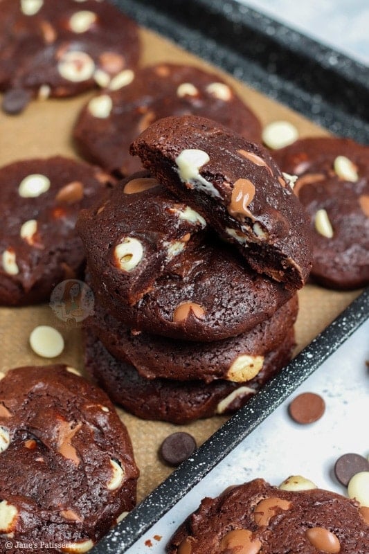 These cookies always turn out beautifully! I would like to make a blondie cookie but on trying the recipe without the cocoa, the mixture was thinner. I tried adding more flour (50g) but it didn’t work and the cookies didn’t really work out as well (although they tasted great.) I also use three types of chocolate. Any ideas? Thank you!