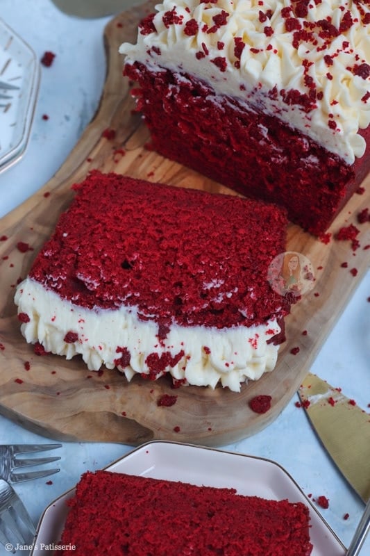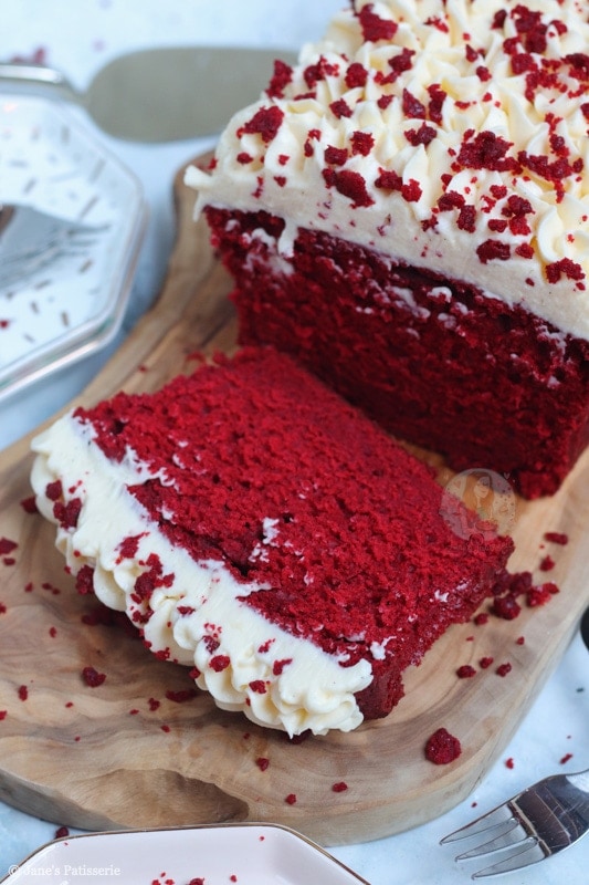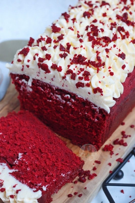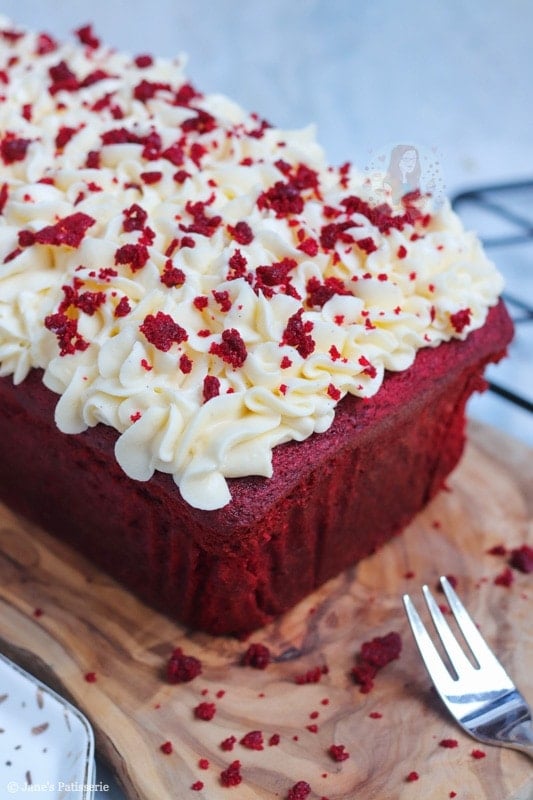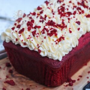 An easy red velvet loaf cake topped with delicious and smooth cream cheese frosting