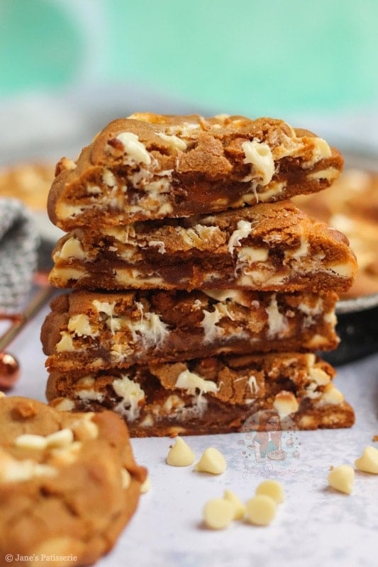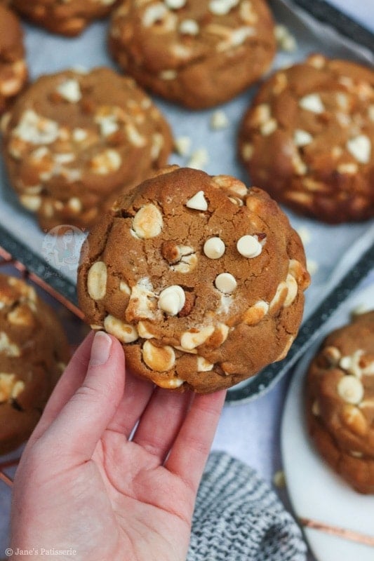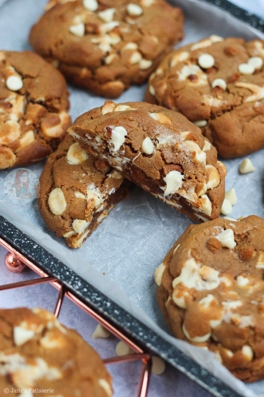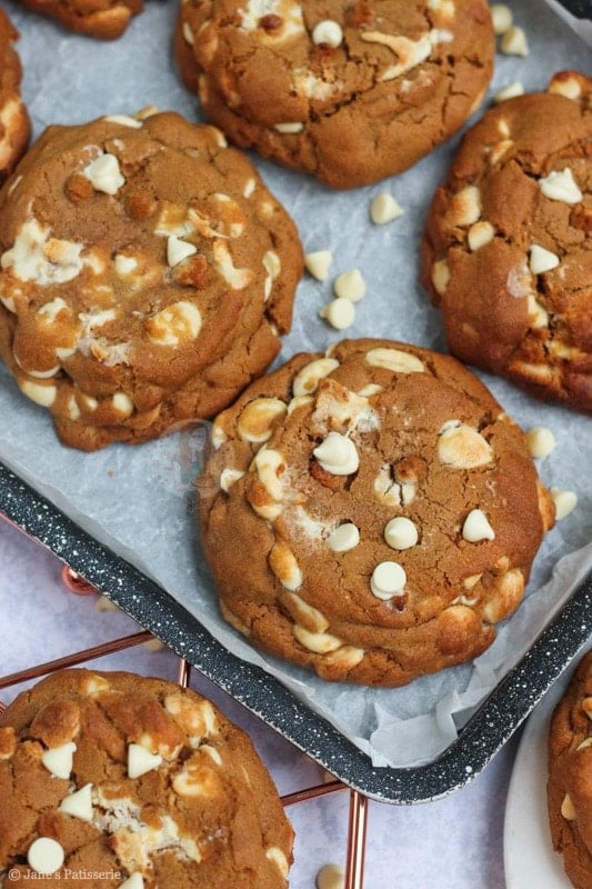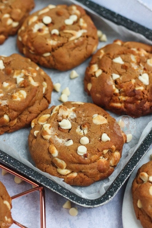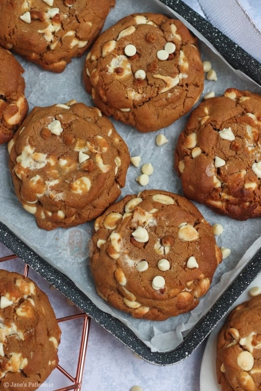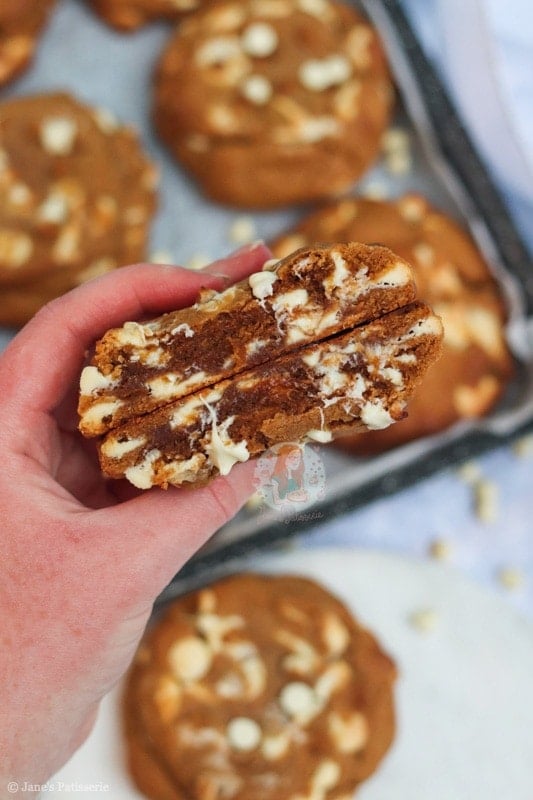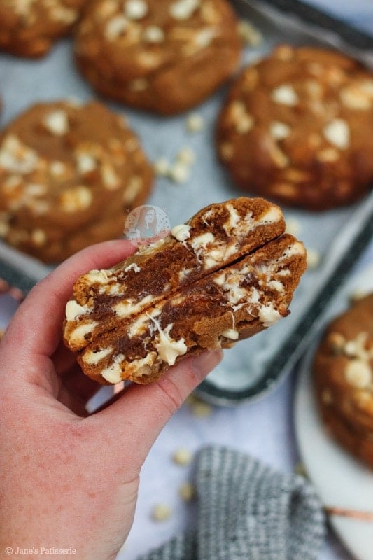 Because the cookie dough uses dark brown soft sugar (to create that much more of a deeper treacle flavour), and the spices, the white chocolate seemed the best contrast!