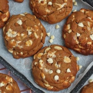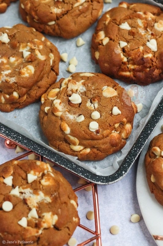 Deliciously thick and chunky gingerbread flavoured gingerbread NYC cookies with white chocolate chips!