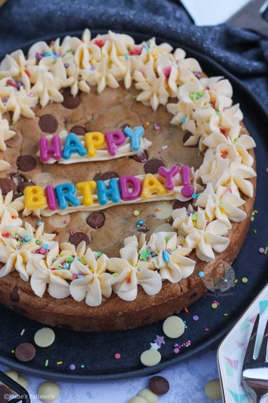 For the topping, I just made a simple vanilla buttercream (you don’t need much as it’s only a cookie!) – and you can colour it to any colour you like!! I then used some shopbought letters for the ‘happy birthday’ and sprinkled on some cute sprinkles from Iced Jems as always!