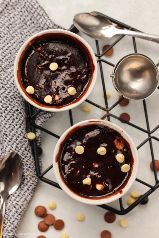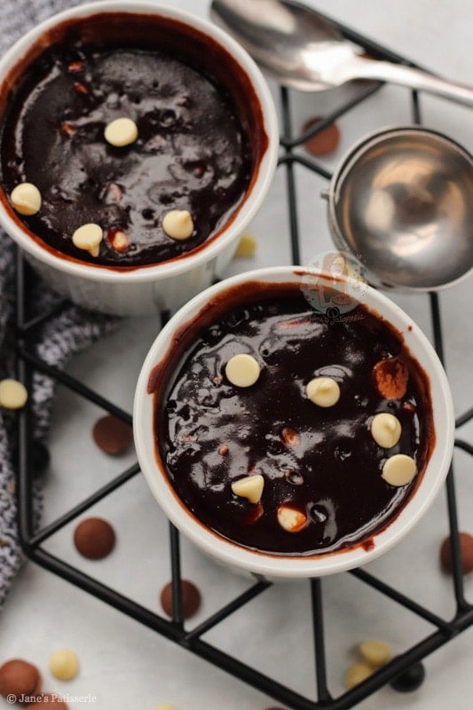 - Add in the chocolate chips and mix in, and split evenly between two microwave safe mugs/ramekins! I use ones 9cm wide, and 5cm deep.