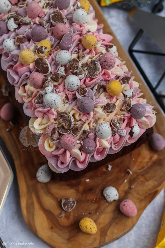 For the frosting, it is just another American buttercream frosting, but they are just so easy!! It’s easy to colour the frosting to the three colours I tend to use for a mini egg cake (like in my mini egg drip cake, and my mini egg chocolate cake).