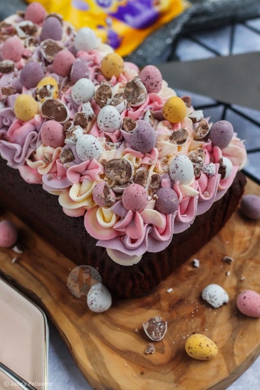 A delicious and easy oil based chocolate cake topped with Mini Egg themed buttercream frosting, and all of the mini eggs!