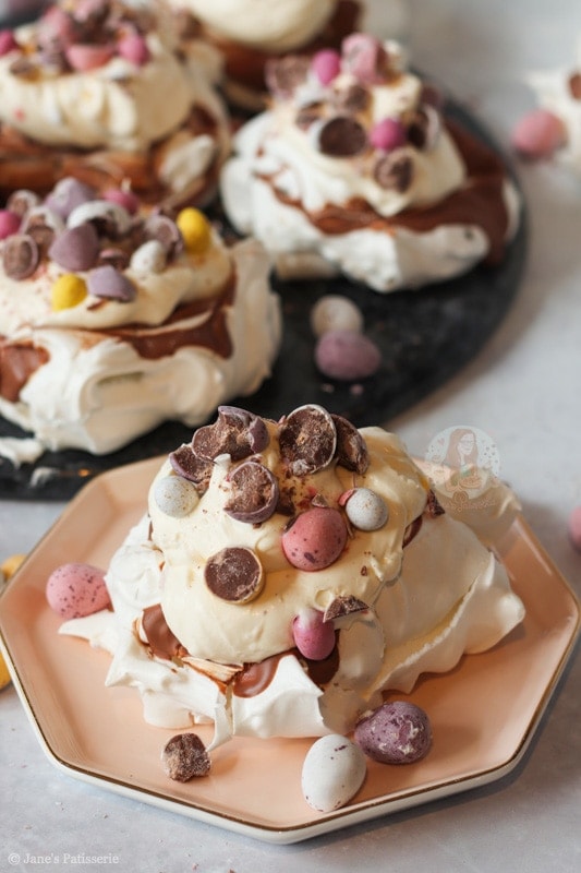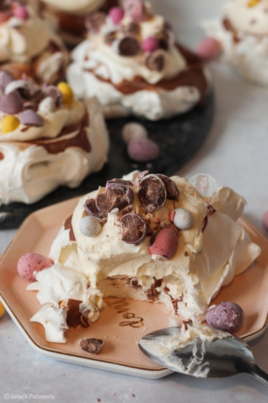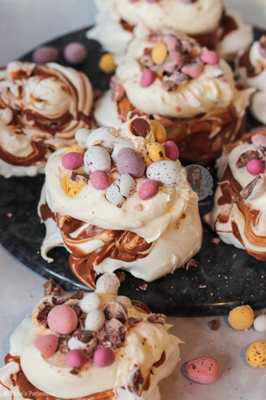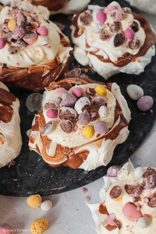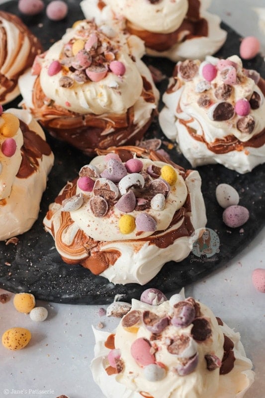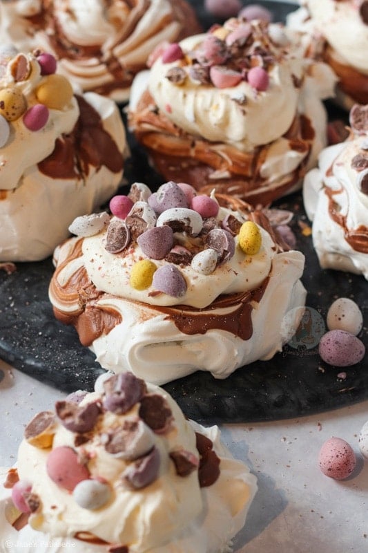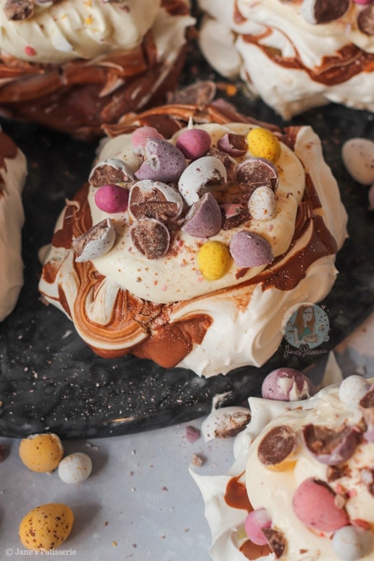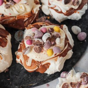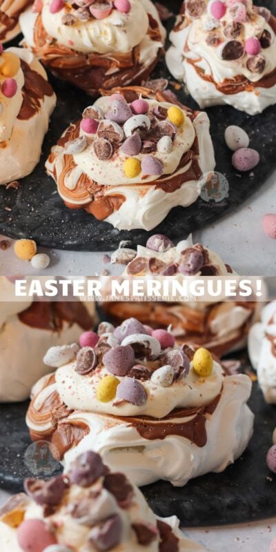 Easy and sweet individual easter meringues with a chocolate swirl, topped with whipped cream and easter chocolates!