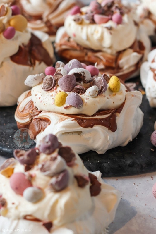 This recipe is inspired by my individual chocolate swirl meringue post from years ago, just with an easter twist! I love anything meringue so these seemed like an easy to make dessert that still look quite show stopping!